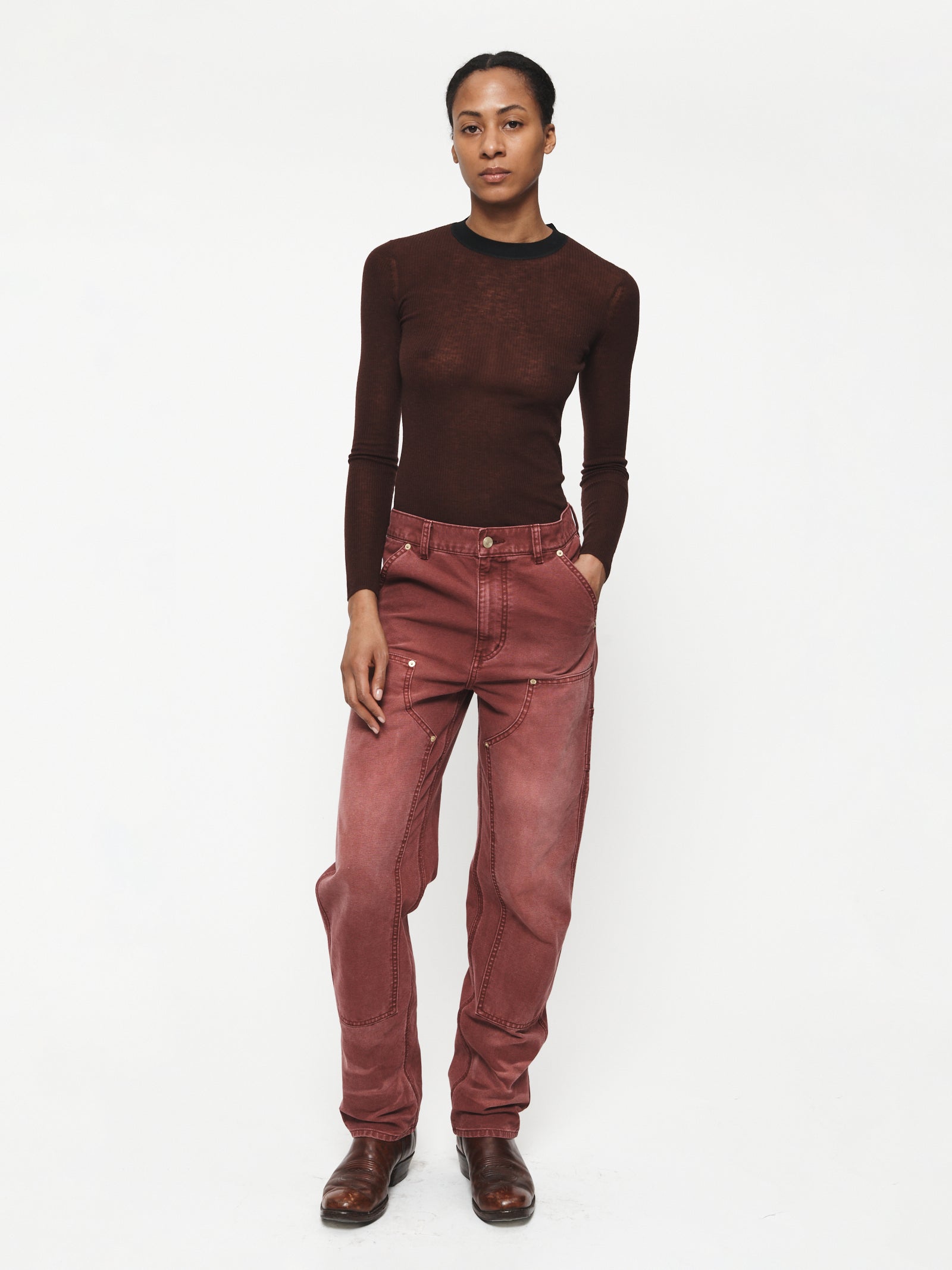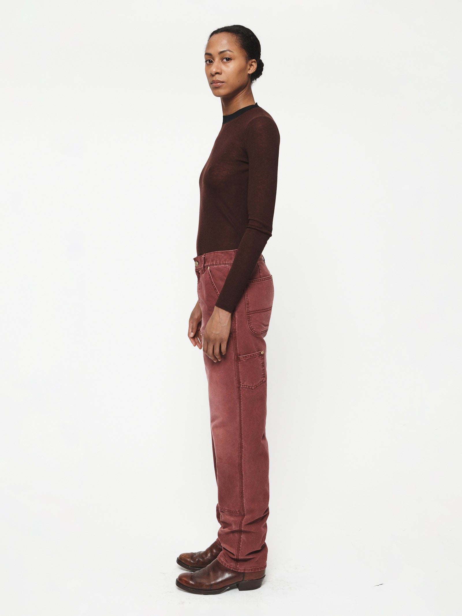 Washed Cotton Canvas Double Knee pant in Pomegranate. Slim, straight leg with long length that sits squarely on the high hip. Five pocket details with extra side pockets, button and zipper closure.