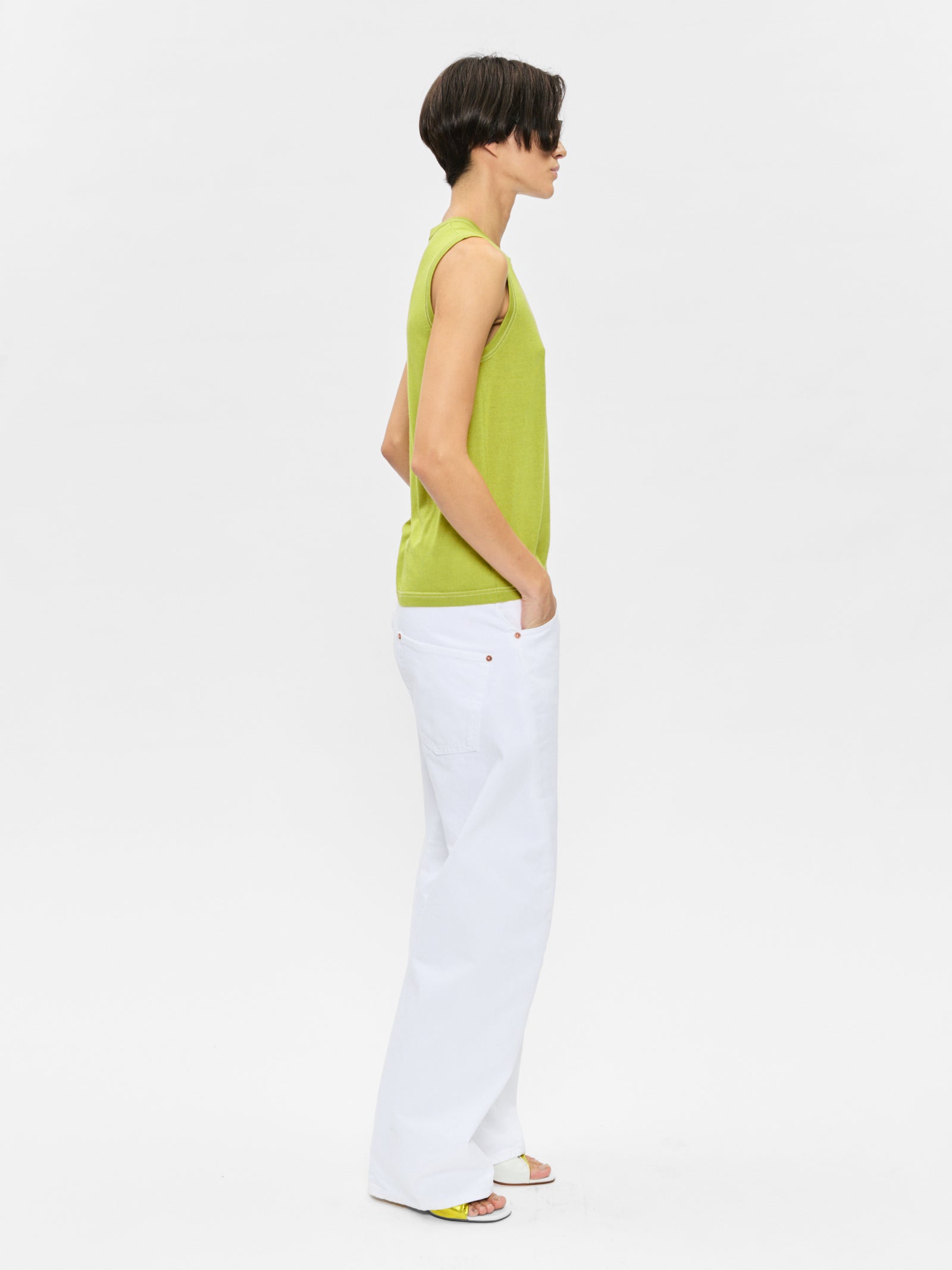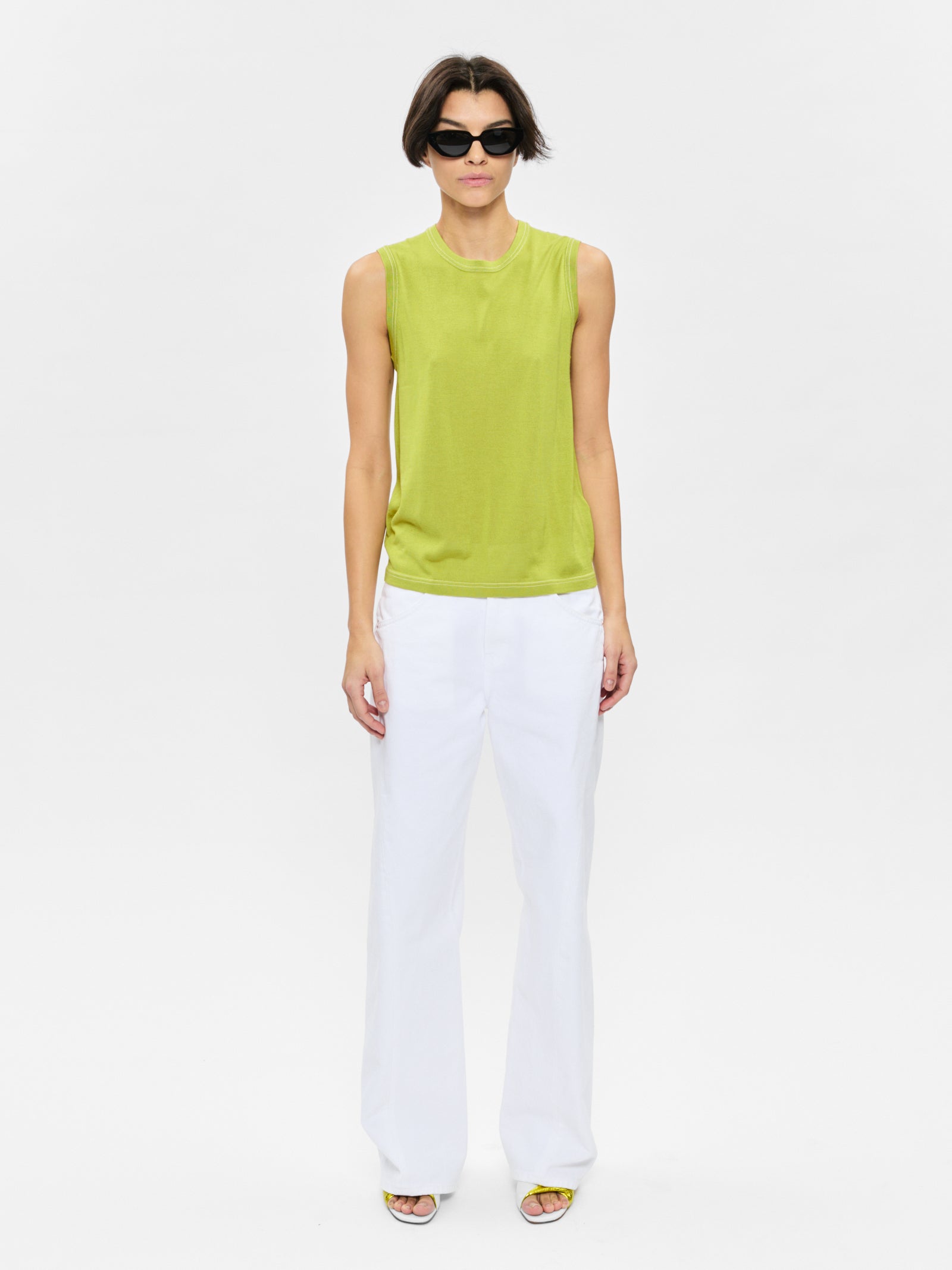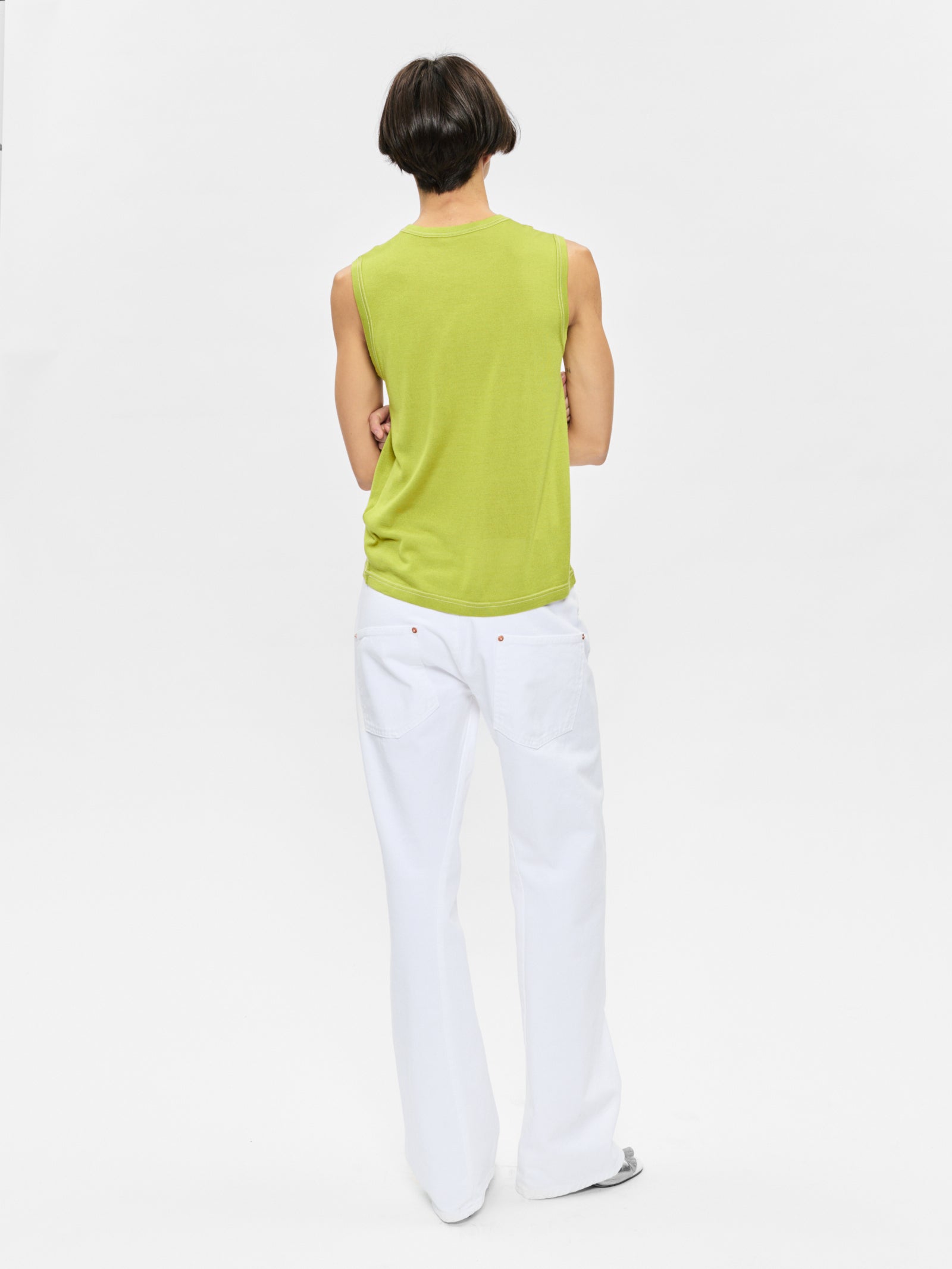 The Contrast Stitch Shell in Asparagus is produced in a slinky silk and cashmere blend yarn. It has a shrunken, slim body with delicate white contrast stitch along neckline, sleeve opening and bottom hem. Perfect styled alone as a top, or layered under the Contrast Stitch Cardigan.