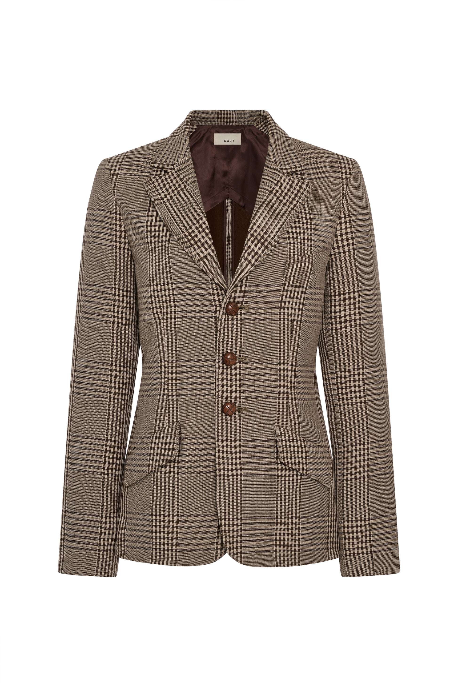 The Doubleface Riding Jacket in Dover Plaid is produced in a deadstock Italian wool blend fabric. The fabric has a puckered nature to it, and the jacket has a shrunken nipped in fit that falls just to the hips. Small lapel and 3 leather button closure, and center back vent.