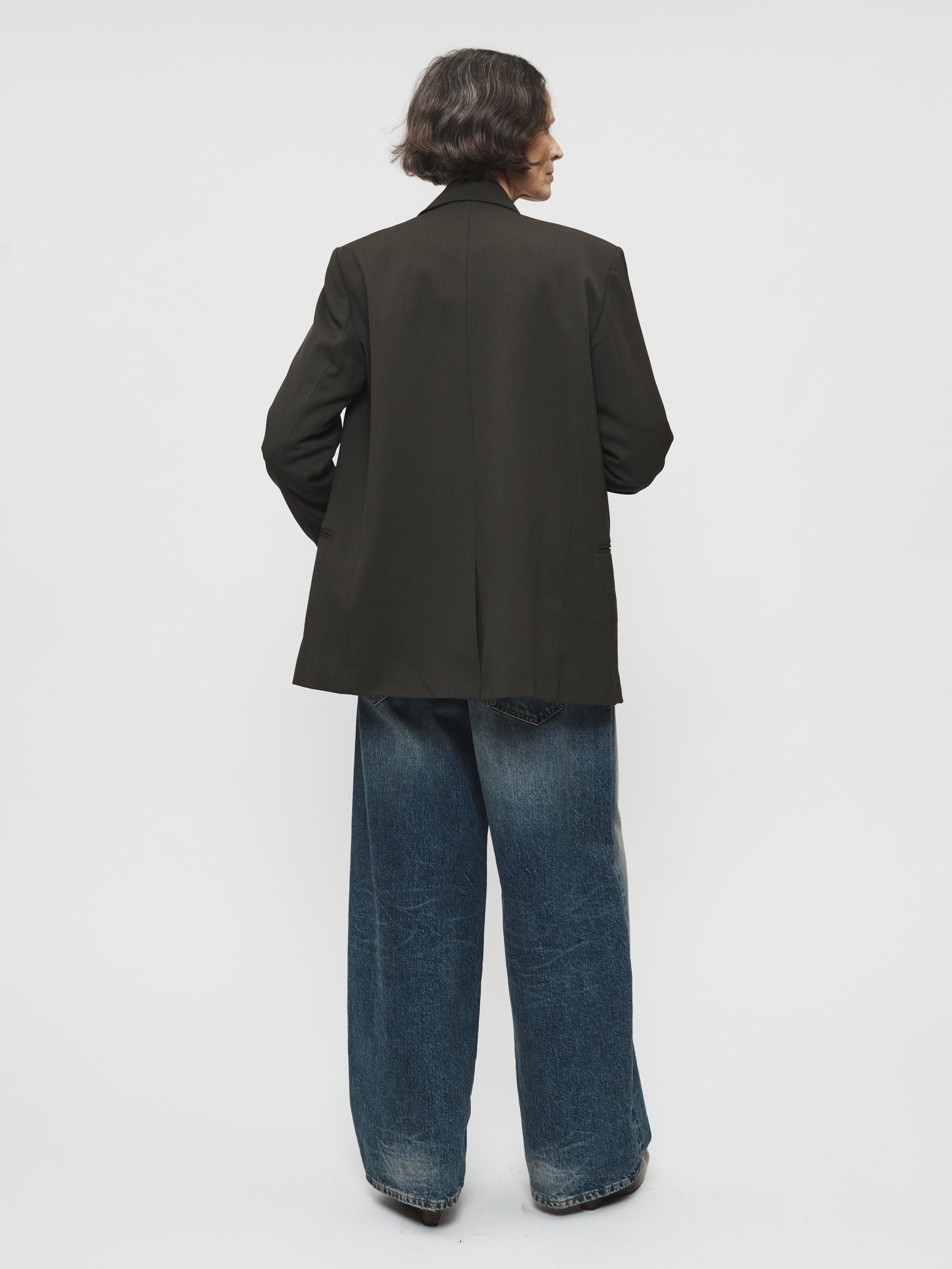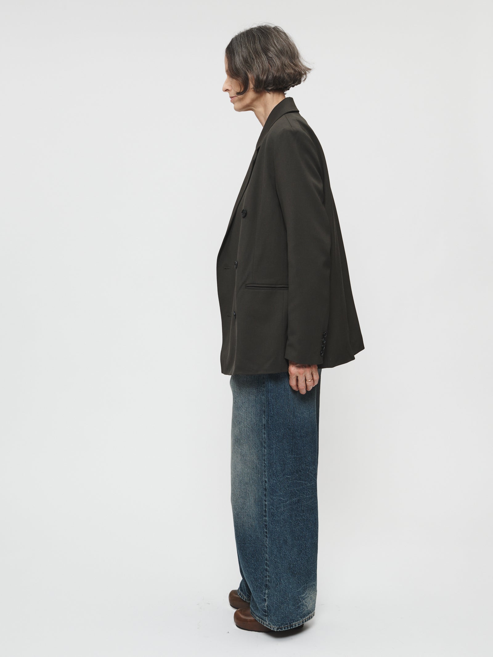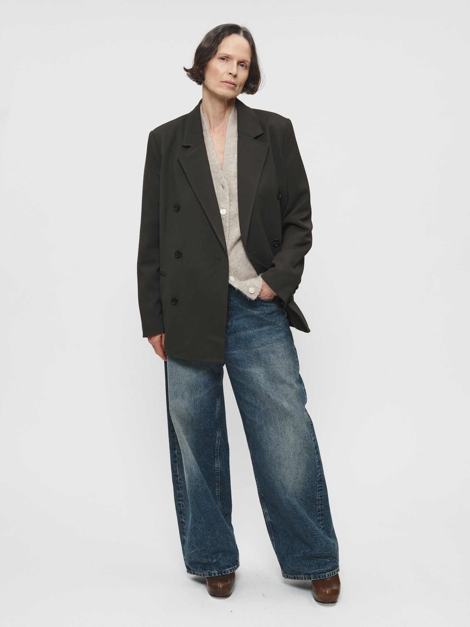 Double breasted blazer with a peak lapel, cut in Italian Wool Twill. This blazer is beautifully structured and menswear inspired. Relaxed with a boxy fit, to slit pockets on the front, single vent at back. Fully lined and finished with horn buttons.