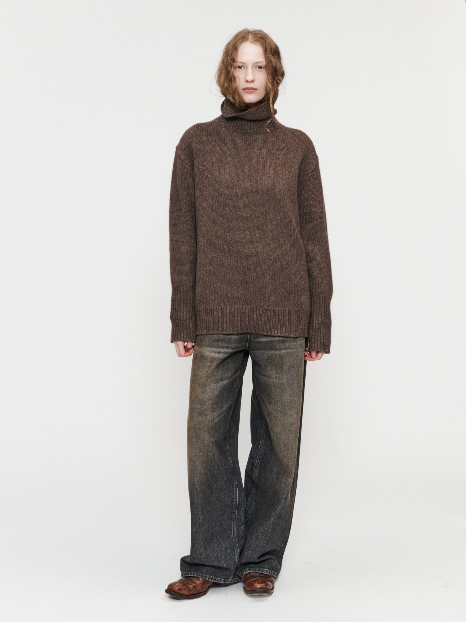 Sylke is 5'9" and wearing a size Small, paired the Roomy Jean in Rugged Mid-Blue and the Grunge Cardigan. Consider sizing down for a neater, less oversized fit.