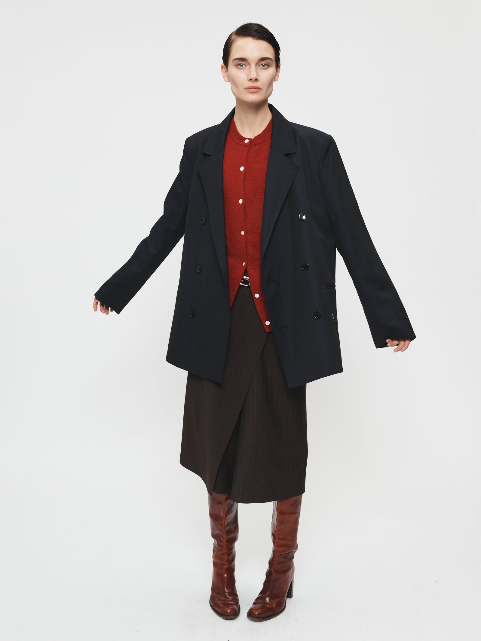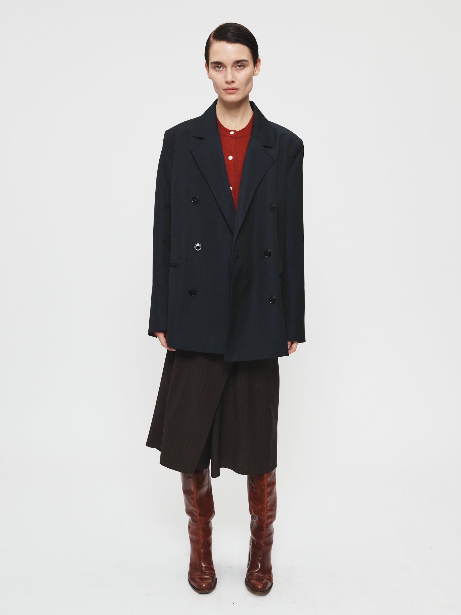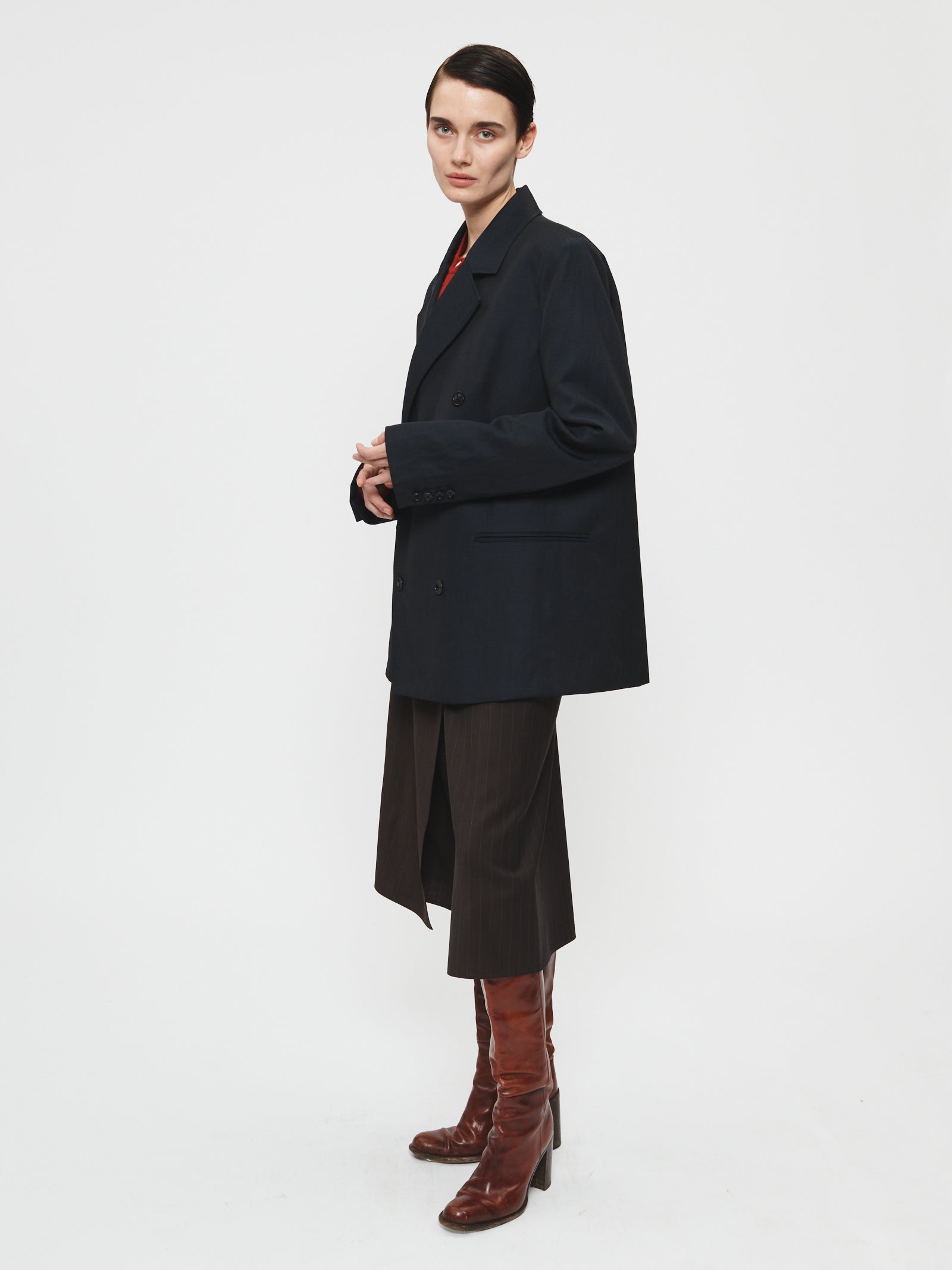 The Double Breasted Blazer in Navy has a peak lapel and is made of lightweight wool / linen blend. Menswear inspired, the fully lined jacket has a structured, boxy fit.