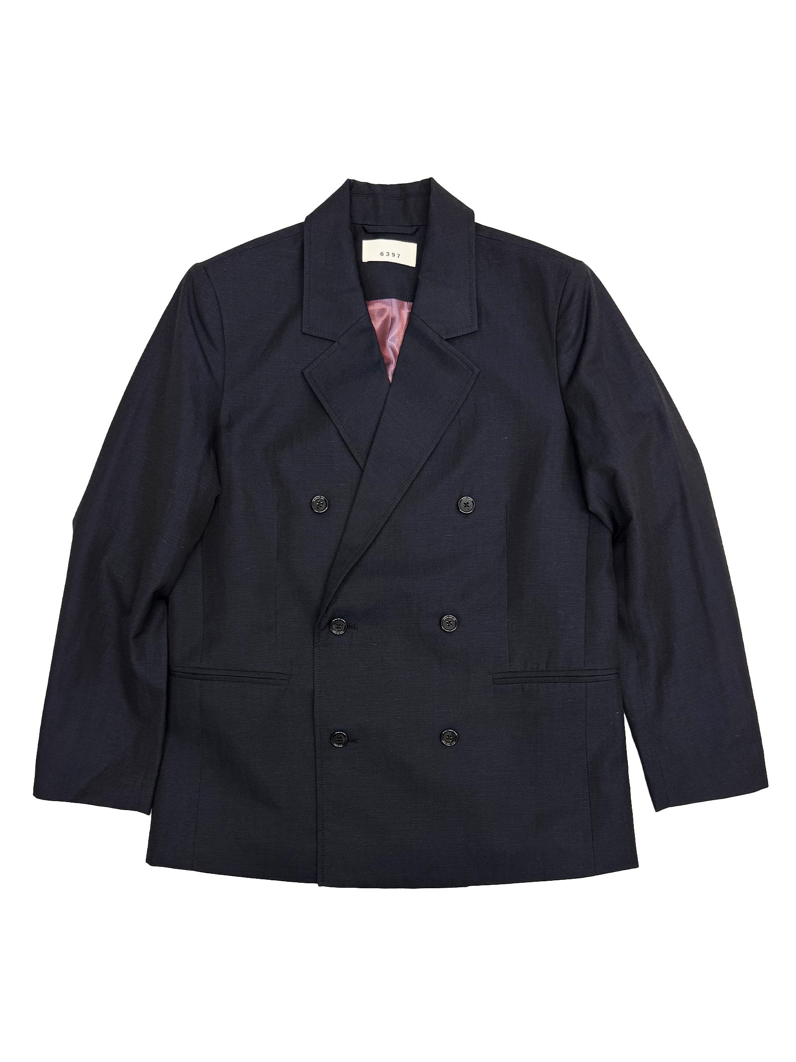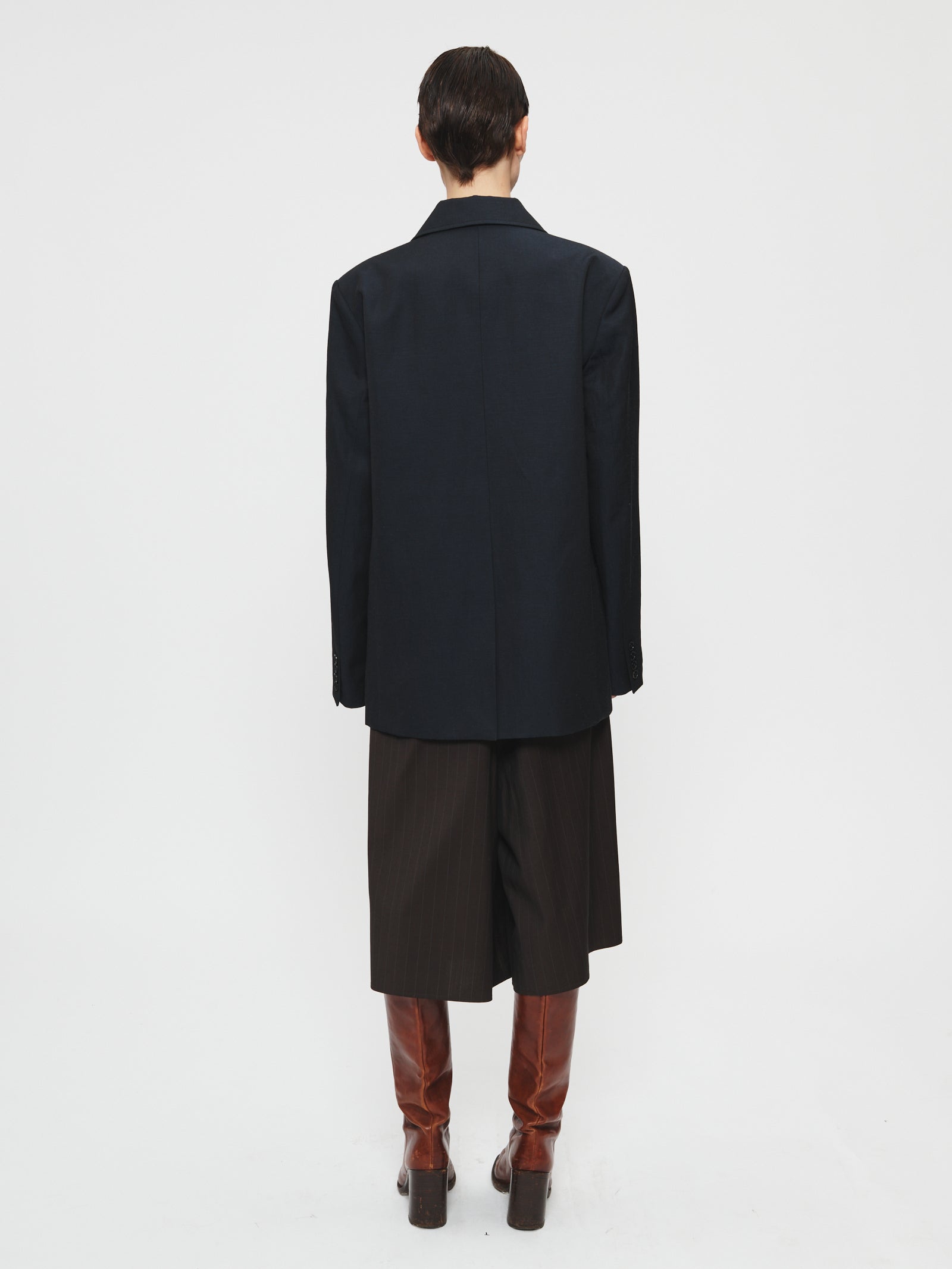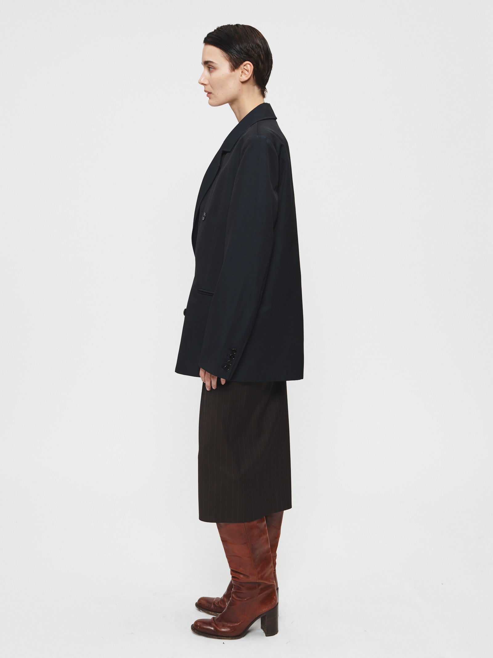 The Double Breasted Blazer in Navy has a peak lapel and is made of lightweight wool / linen blend. Menswear inspired, the fully lined jacket has a structured, boxy fit.