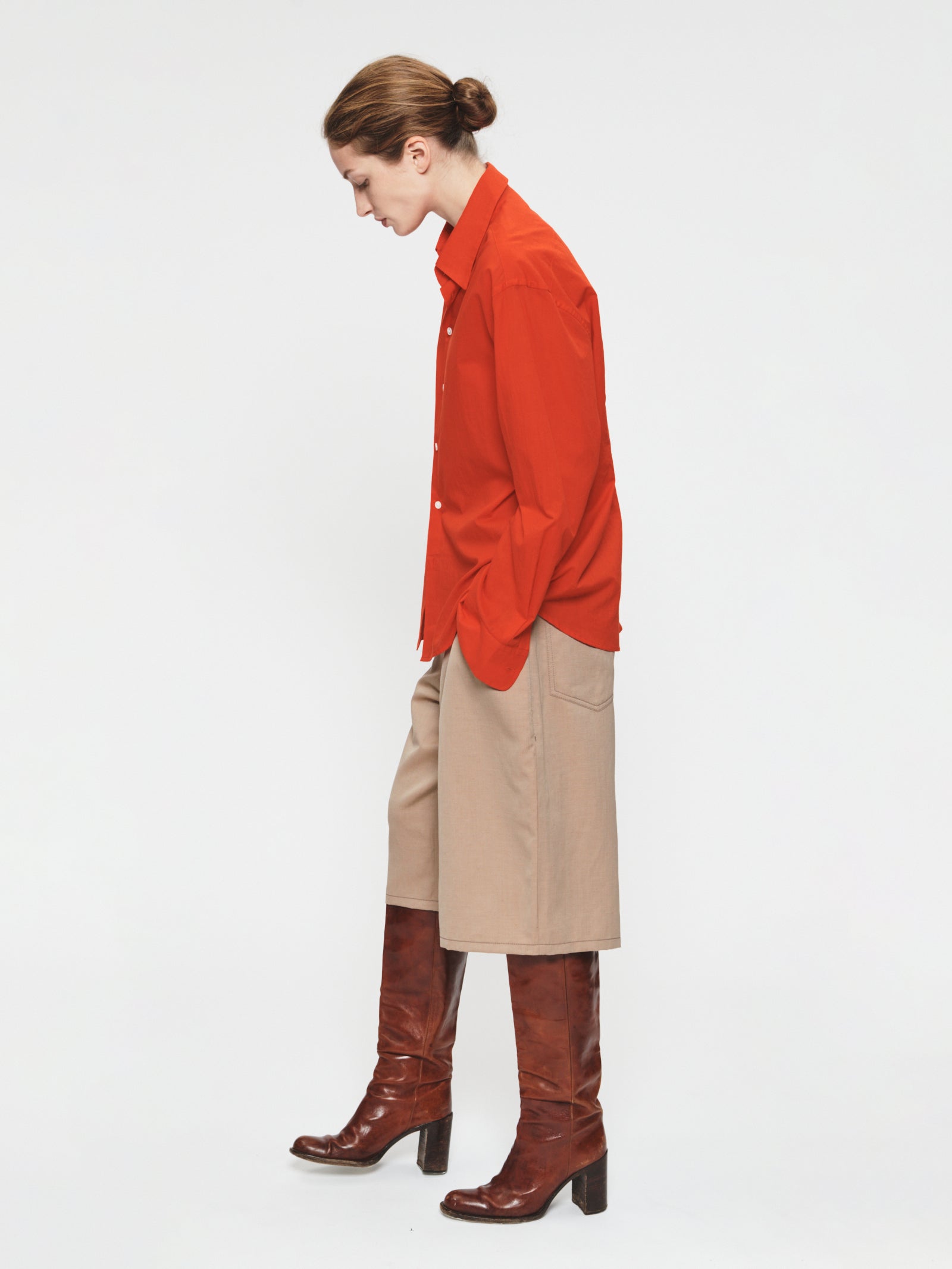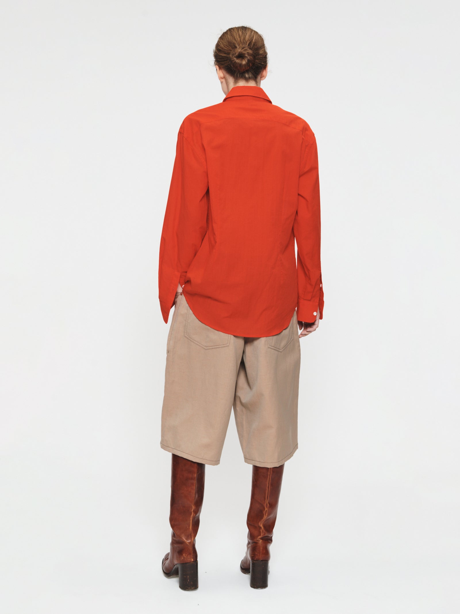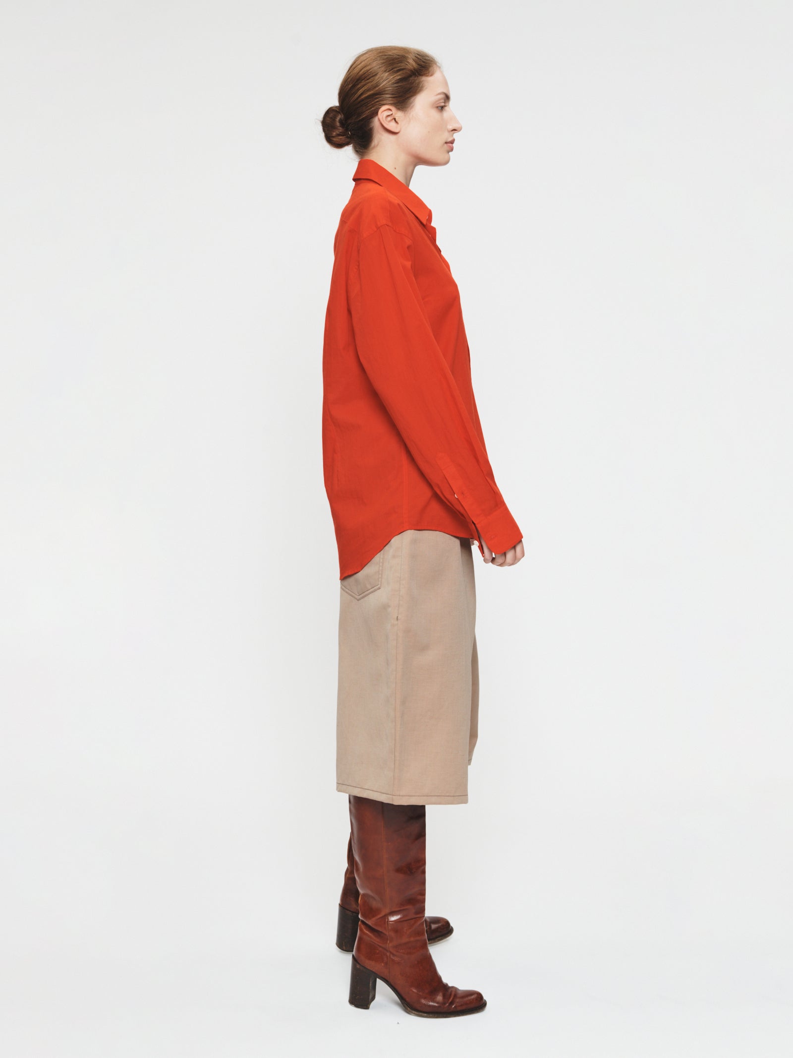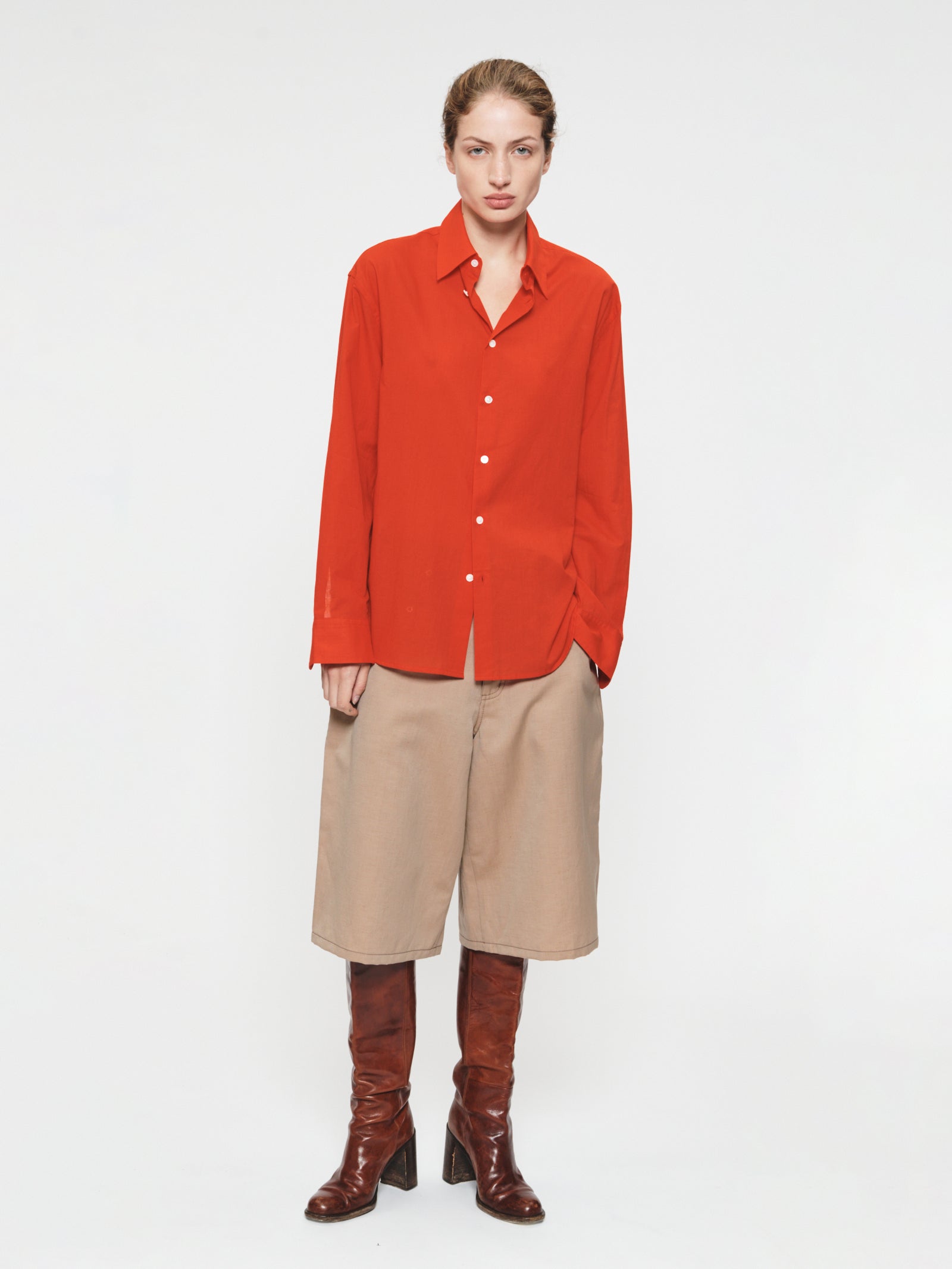 The Dress Shirt in Pimento is made of a fine Japanese cotton and silk shirting. With darting on the back, the slim shirt tapers slightly at the waist and has a slight sheerness to it. Fits true to size.