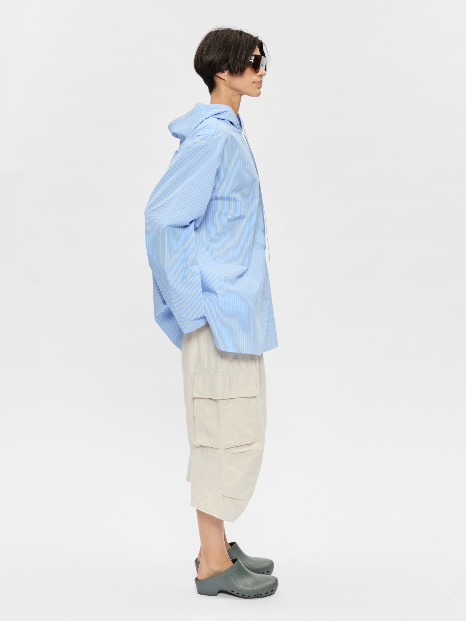 The Hooded Shirt is produced in a Japanese striped cotton poplin. It has a mega oversized fit and is almost poncho-like in spirit with a big hood. Contrast black stitch on back yoke and raw edge hem with side seam pockets.