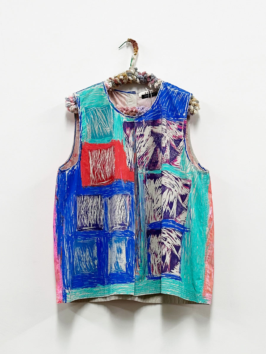 Sleeveless crisp cotton top with artwork by Creative Growth Artist Kathleen Miller. Inverted pleat at front neckline for volume. Back keyhole snap entry/closure. 100% Cotton.