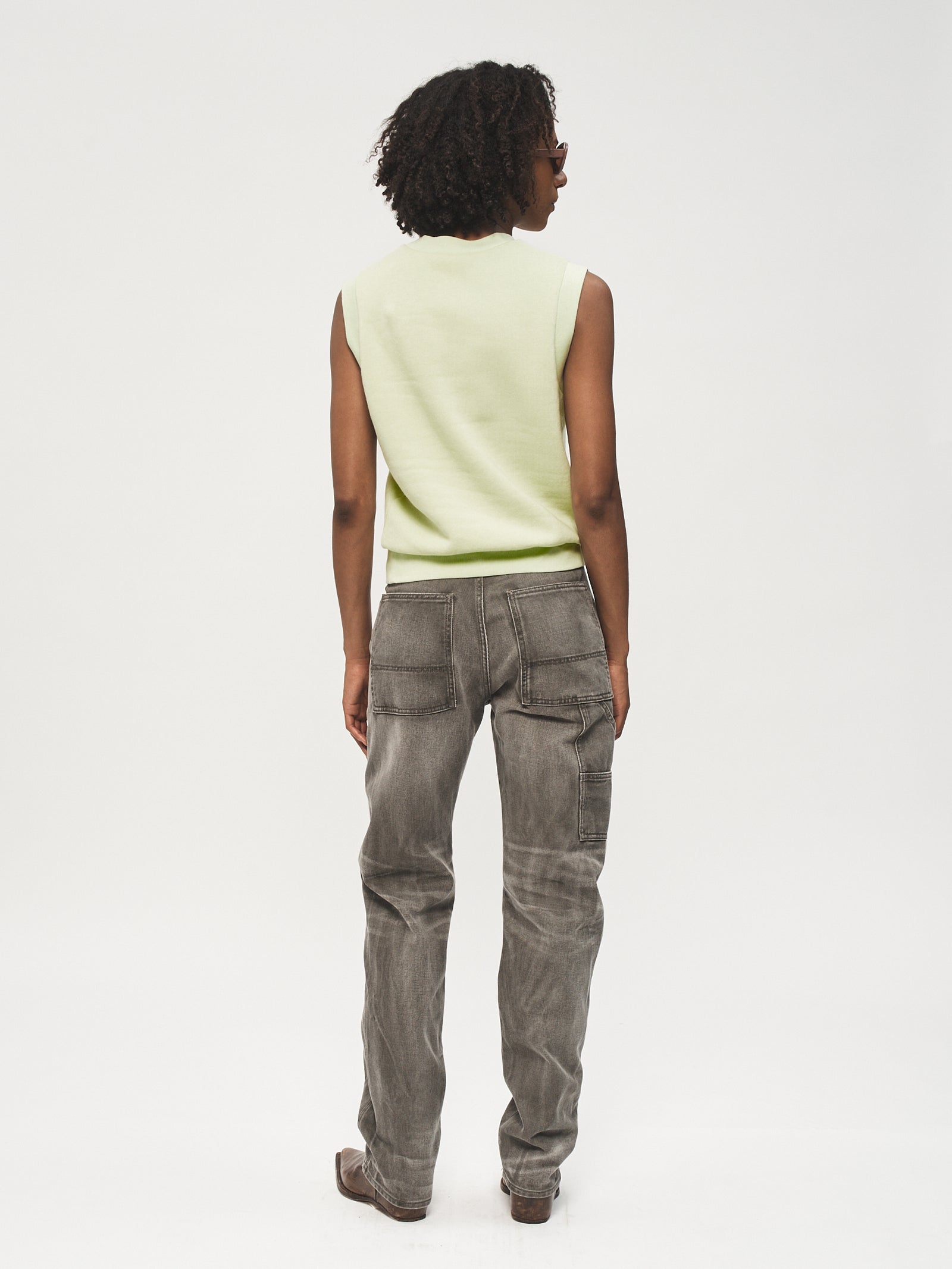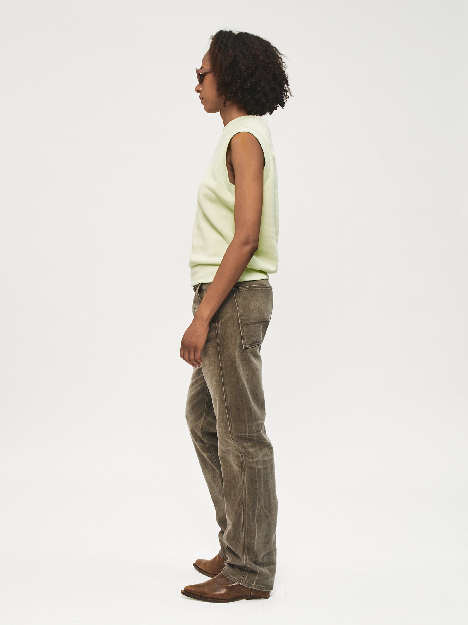 Printed canvas Painter Jean in a distressed charcoal colorway with whiskering throughout. Relaxed straight leg and mid-rise fit with carpenter pocket details. Traditional 5-pocket details, button and zip closure. We’d recommend taking your normal size.