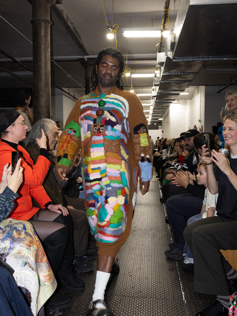 Lulu Sotelo is greatly influenced by her upbringing in Mexico City. In her distinct figurative style, she creates portraits of herself, her friends, and characters from her favorite Mexican sitcom ‘El Chavo del Ocho’. With large heads, exaggerated facial features, and peg-like extremities, her characters are bright and colorful, sometimes accompanied by symbolic imagery. An admirer of fashion, Sotelo pays special attention to the clothing in her drawings, devising festive outfits from her imagination or rendering apparel true to life. In her textile practice, Sotelo combines painting, weaving, sewing, and embroidery (Lulu has invented her own embroidery knots) on clothes, and creates one-of-a-kind garments covered with her signature characters. Sotelo also makes her characters into plush dolls, complete with costumes and removable hats.