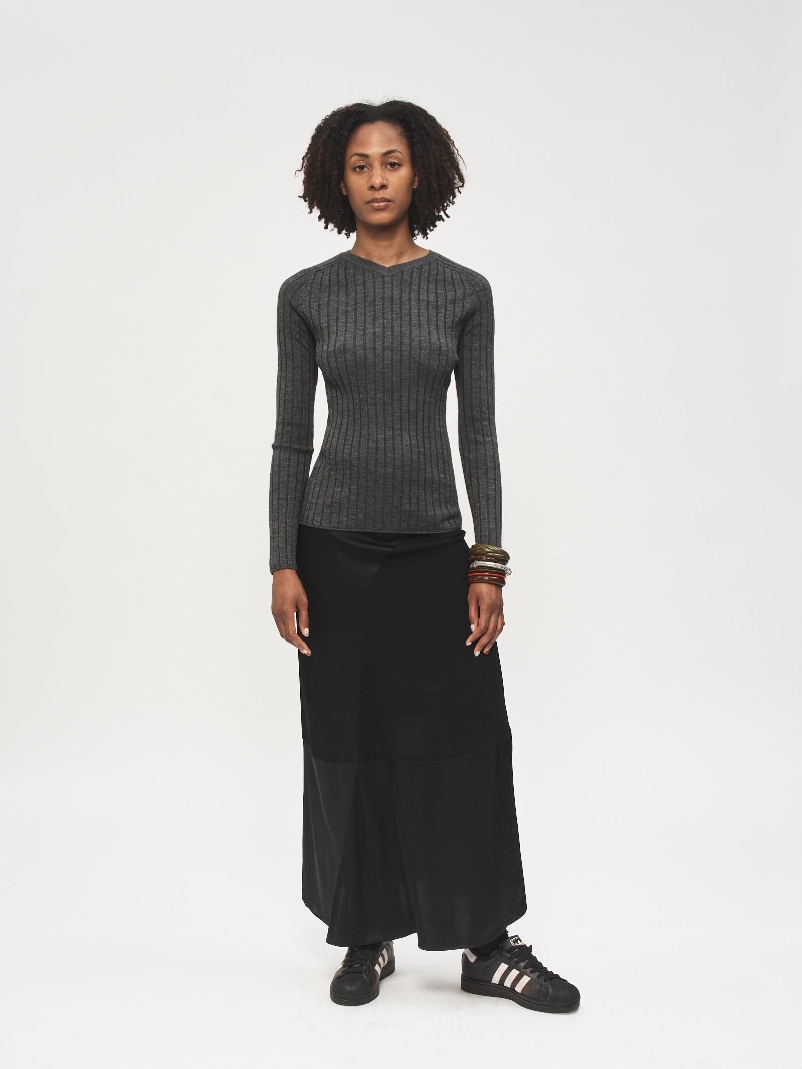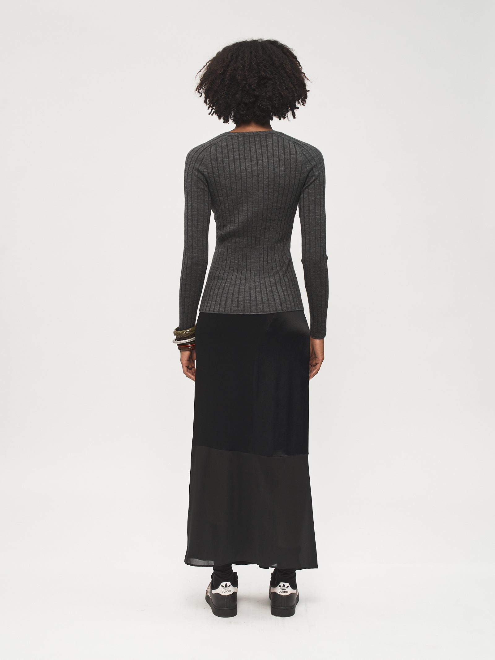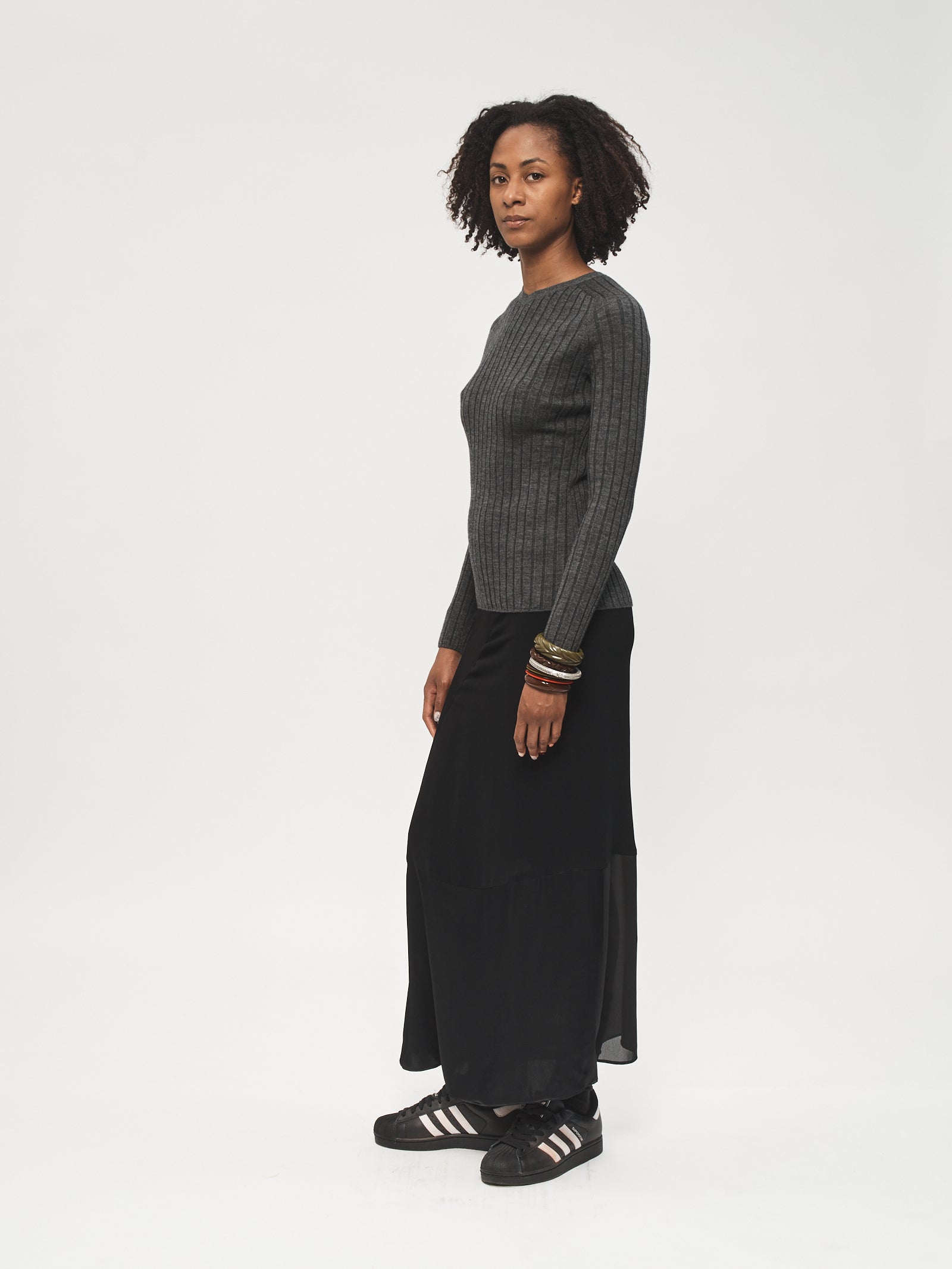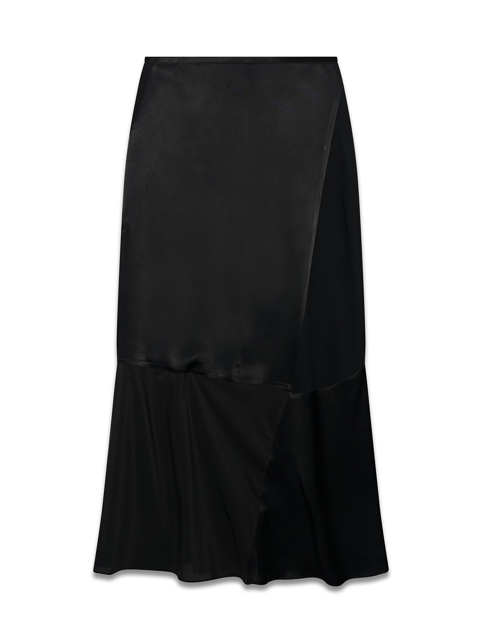 Patchworked skirt with mixed fabrics, giving areas of high shine, matte crepe and a panel of sheerness at the very bottom. Slight a-line fit that falls to the ankle. Pull on with hidden zipper closure.