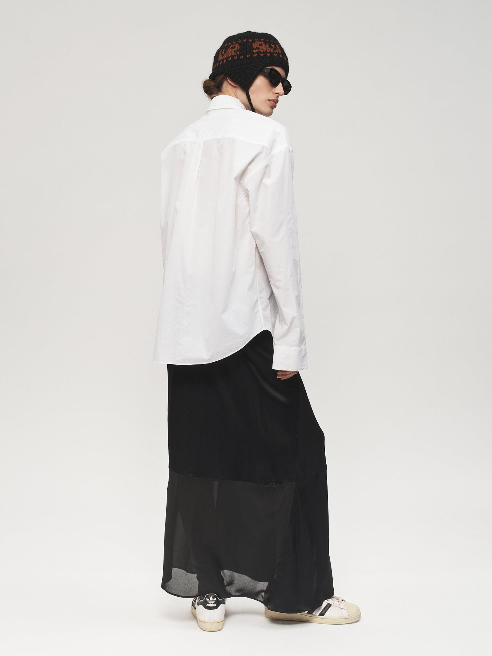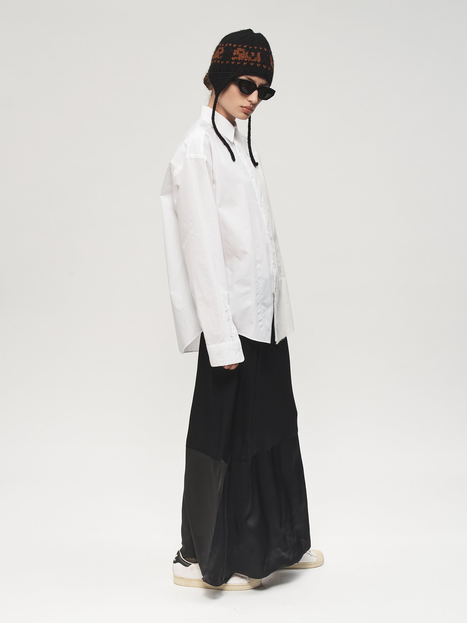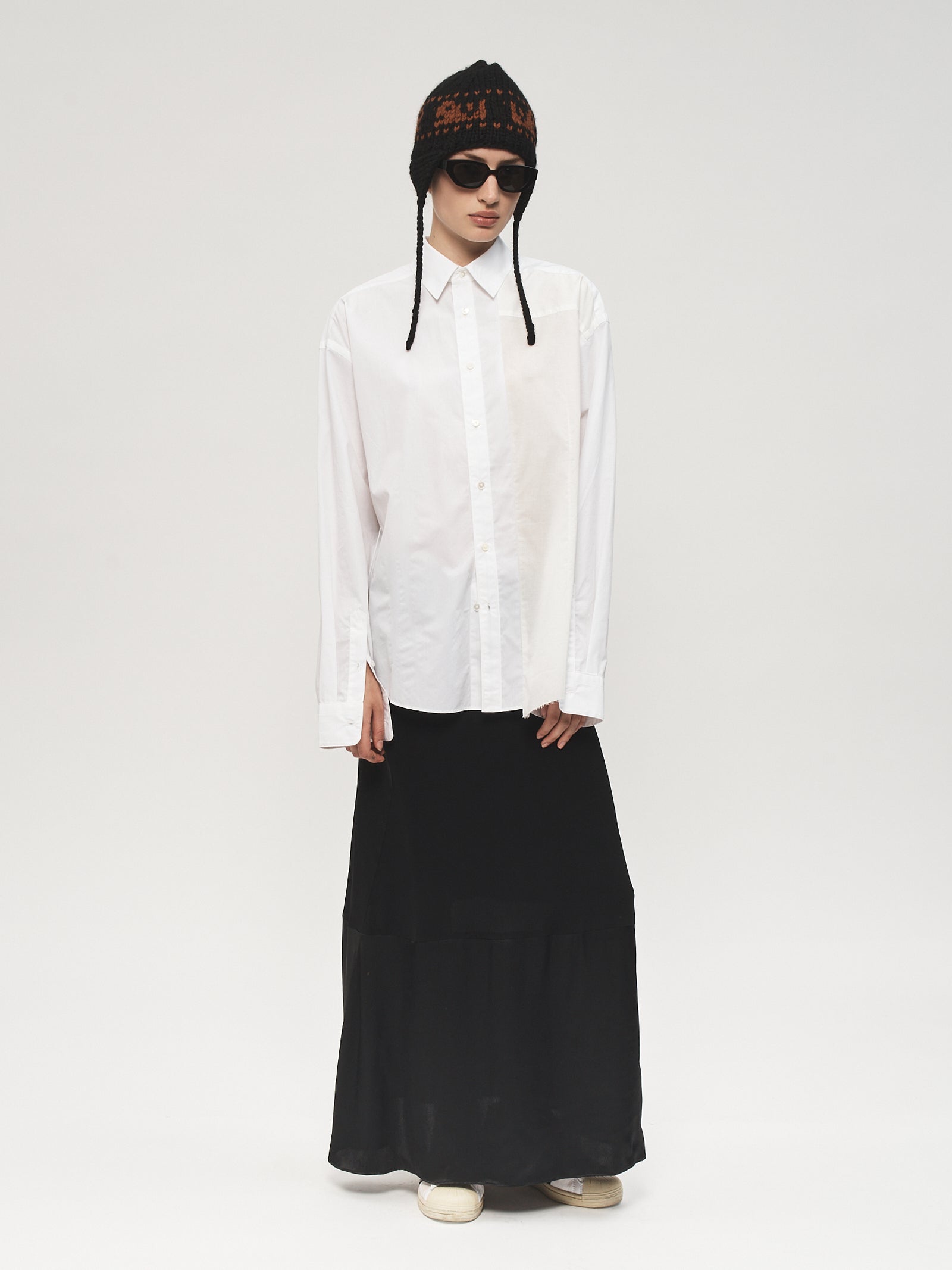 The Reworked Uniform Shirt takes our best-selling body and adds a twist (or two). Patchworked body features 3 tonal shirting fabrics. Asymmetric front hem with raw edge on one side and shirt cuffs that are turned to the front.