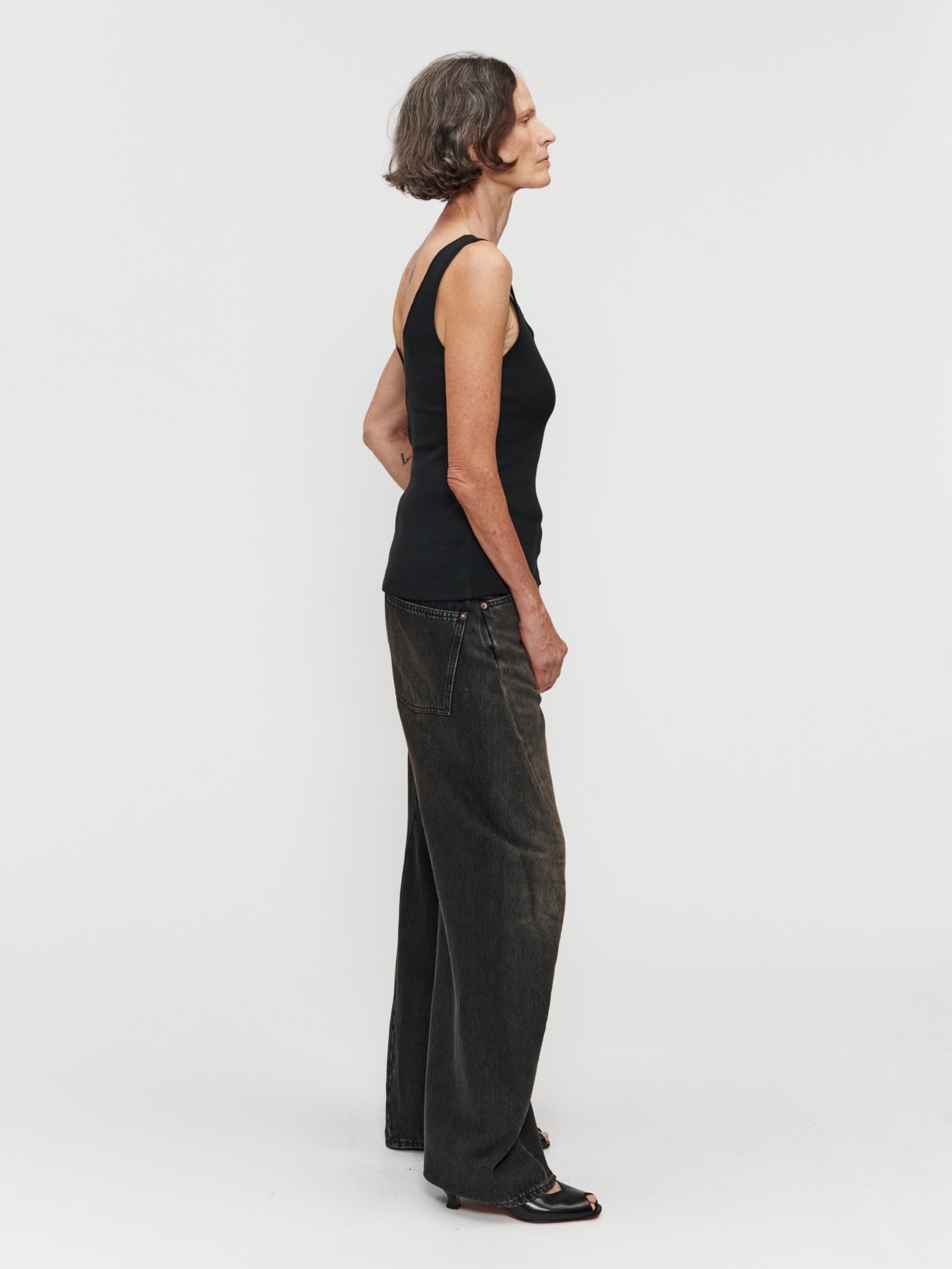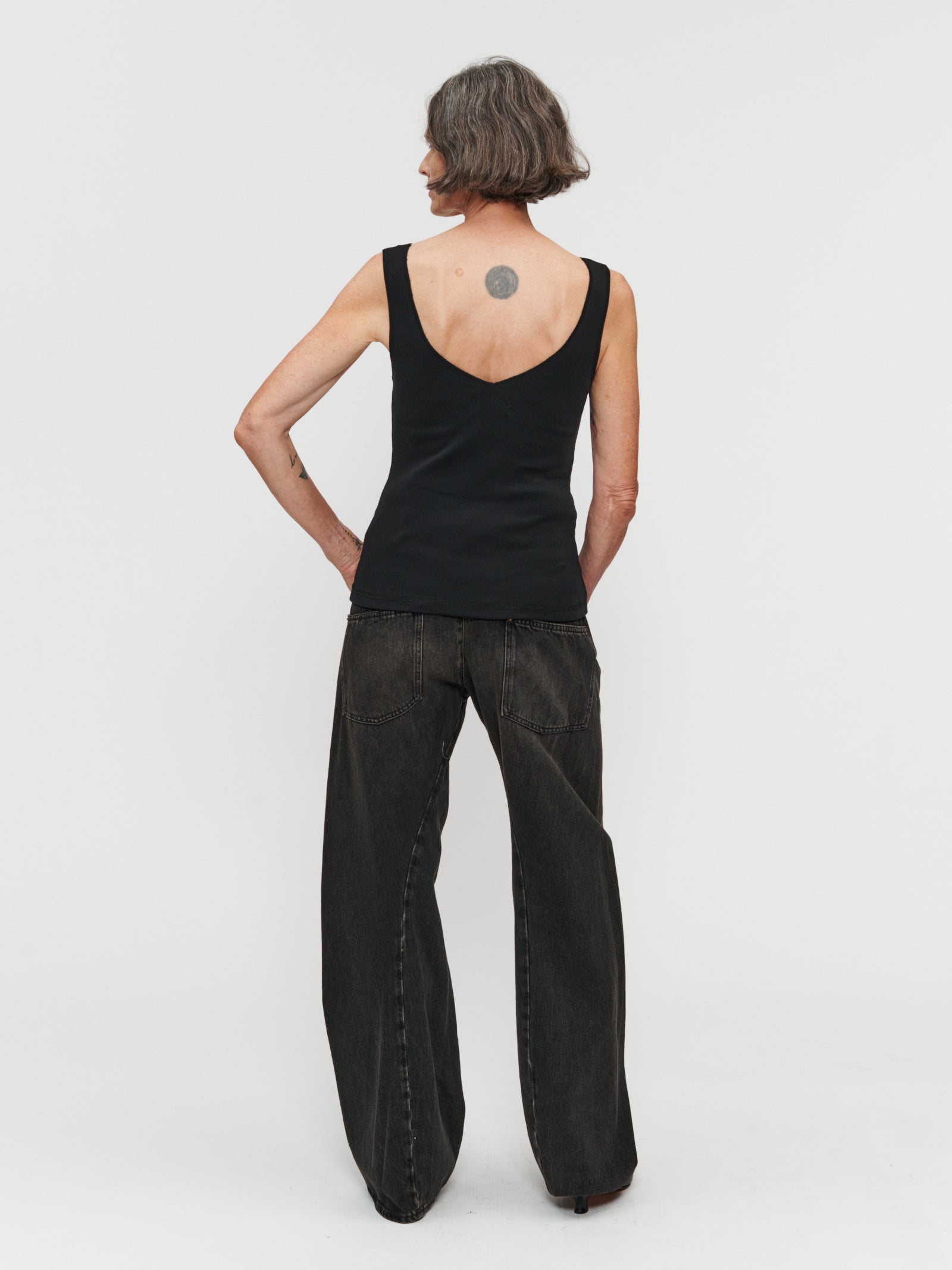 The Ribbed V-Tank in Jet is produced in a superfine ribbed knit jersey. It has wide set shoulder straps and a deep v opening at front and back. Bra friendly. Slim fitting, elongated body.