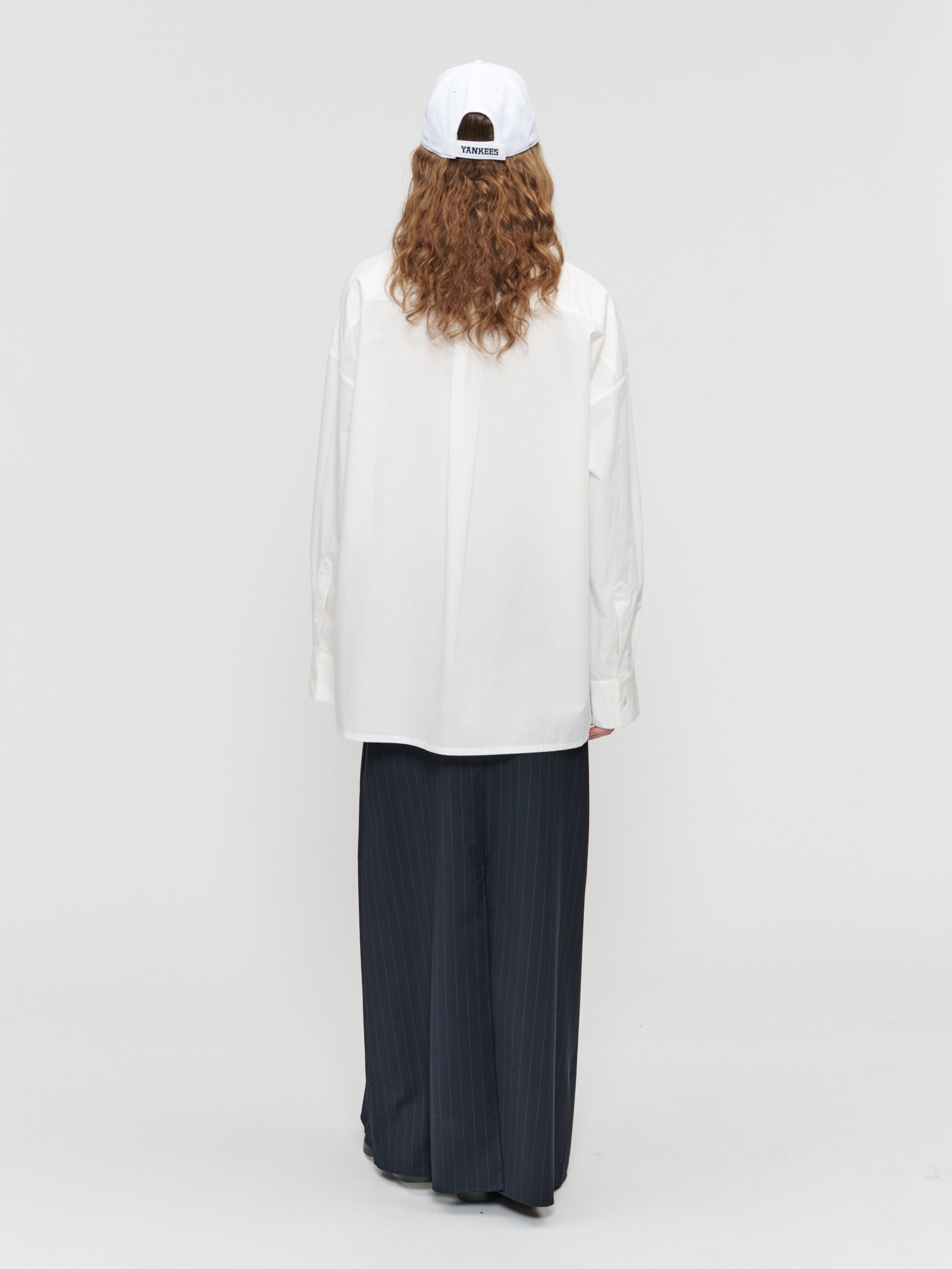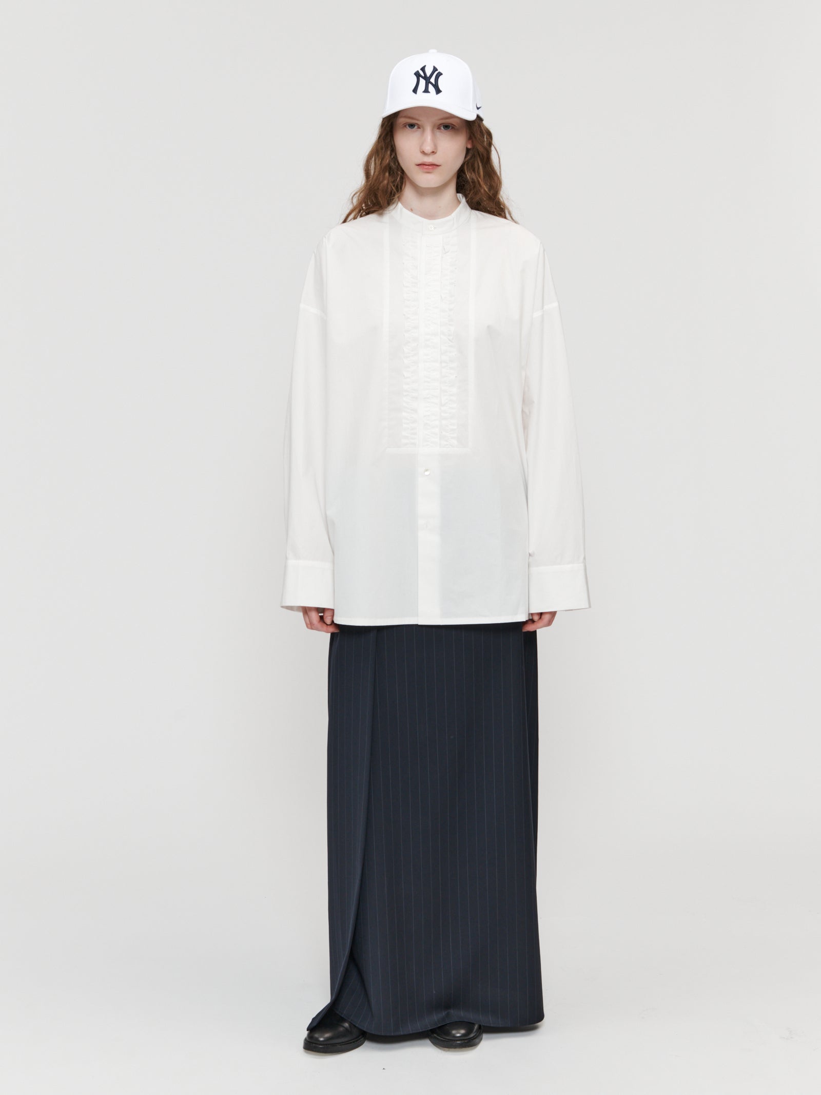 The Single Pleat Column Skirt is made of a Italian lightweight suiting wool. With a fine pinstripe throughout, the slim elongated skirt has an invisible zipper closure at the center back, and inverted pleat detail across the front. Full length, falling to the ankle on most. Slit at center back for beautiful movement when worn.
