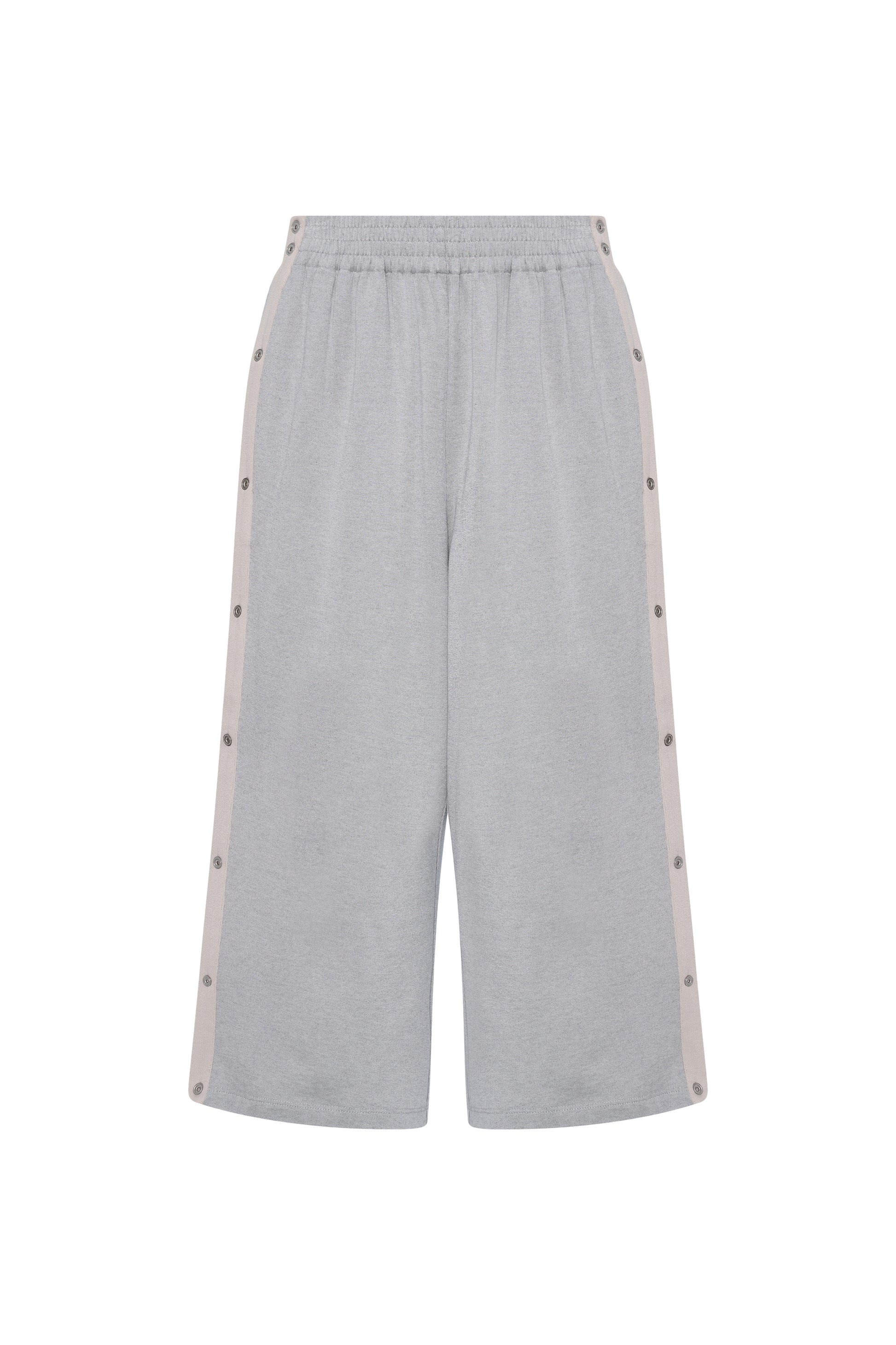 The Tearaway Shorts in Silver are produced in a Japanese cotton & rayon blend jersey. The jersey has a sporty soccer jersey-like hand-feel, with a slight sheen on the exterior from the rayon yarn. Short cropped length that falls mid-calf with full snap closure starting at the waistband going to the bottom hem. Elasticated waist. Fits true to size.