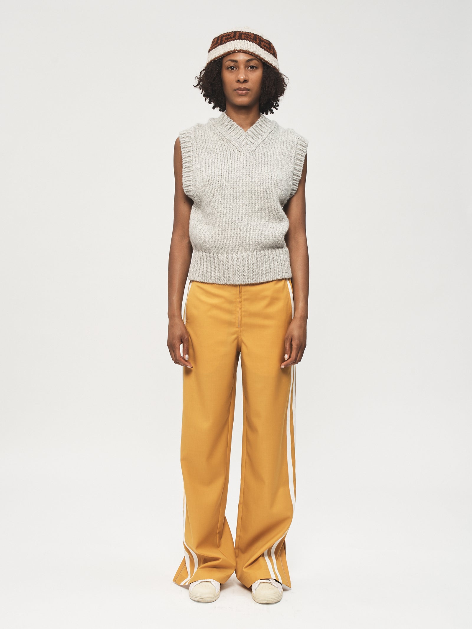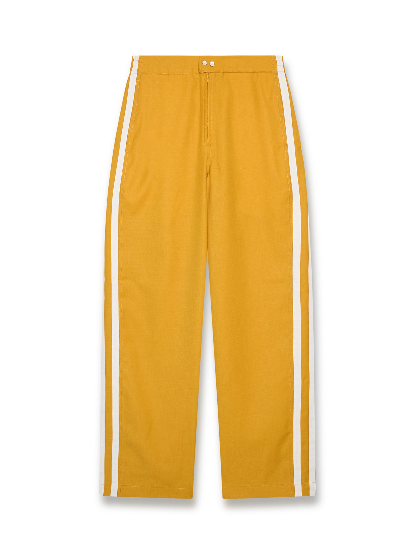 Our Track Pant is a new spin on the classic, mixing the worlds of tailoring and sport. Cut in a Japanese wool poly tailoring fabric, it has sport stripes at the side seams and an easy pull-on elasticated waist with snap button and zipper front closure. Hidden zippers at the outer seam bottom opening allows you to open or close. The pant has a mid-rise with a relaxed, straight leg.