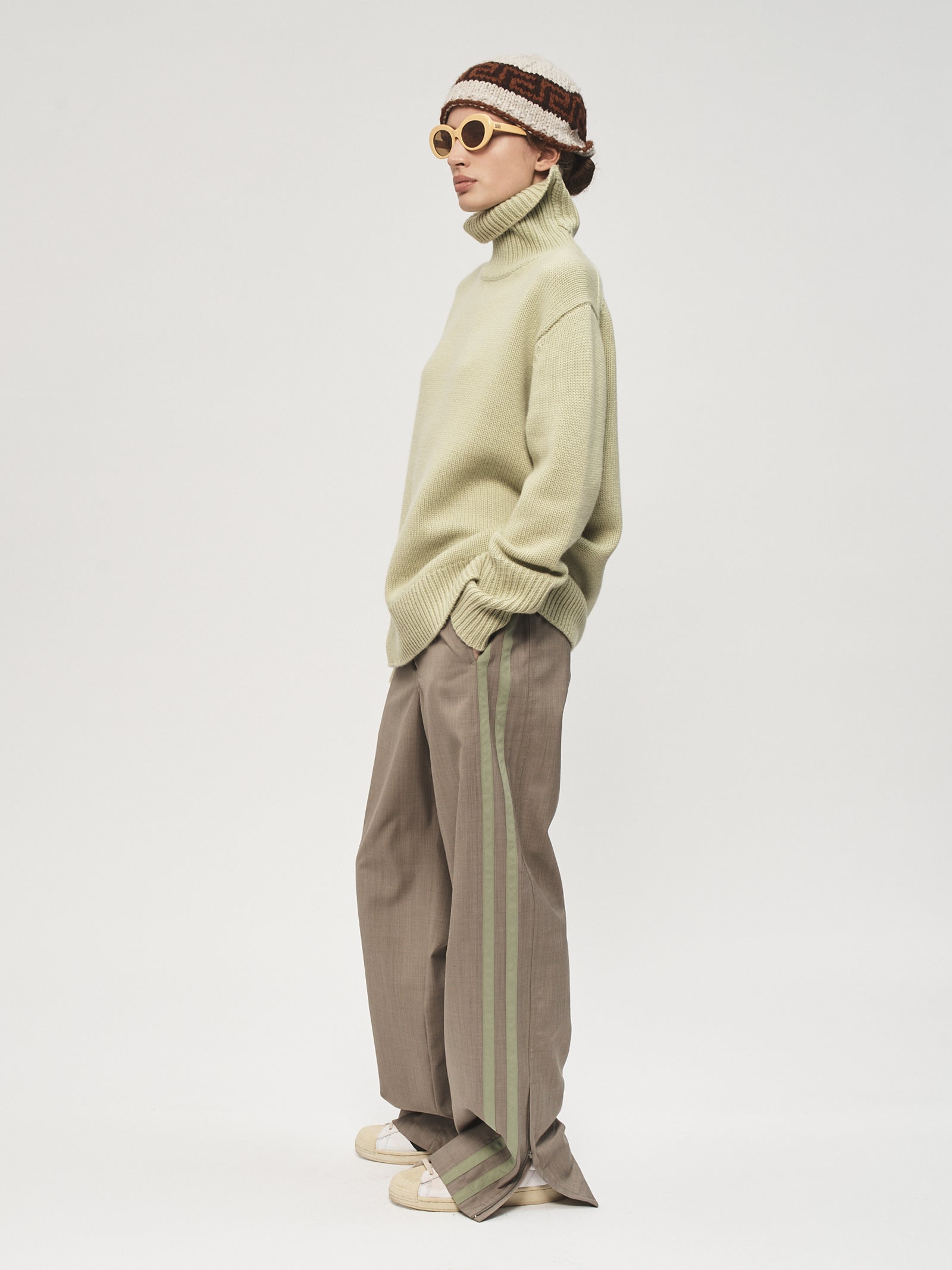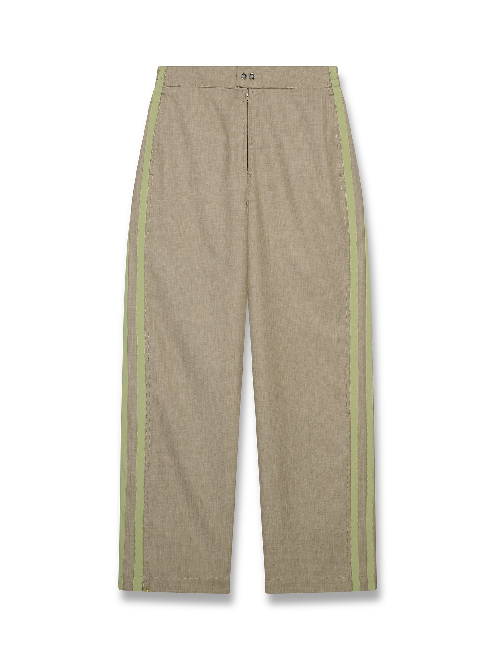 Our Track Pant is a new spin on the classic, mixing the worlds of tailoring and sport. Cut in a Japanese wool poly tailoring fabric, it has sport stripes at the side seams and an easy pull-on elasticated waist with snap button and zipper front closure. Hidden zippers at the outer seam bottom opening allows you to open or close. The pant has a mid-rise with a relaxed, straight leg.