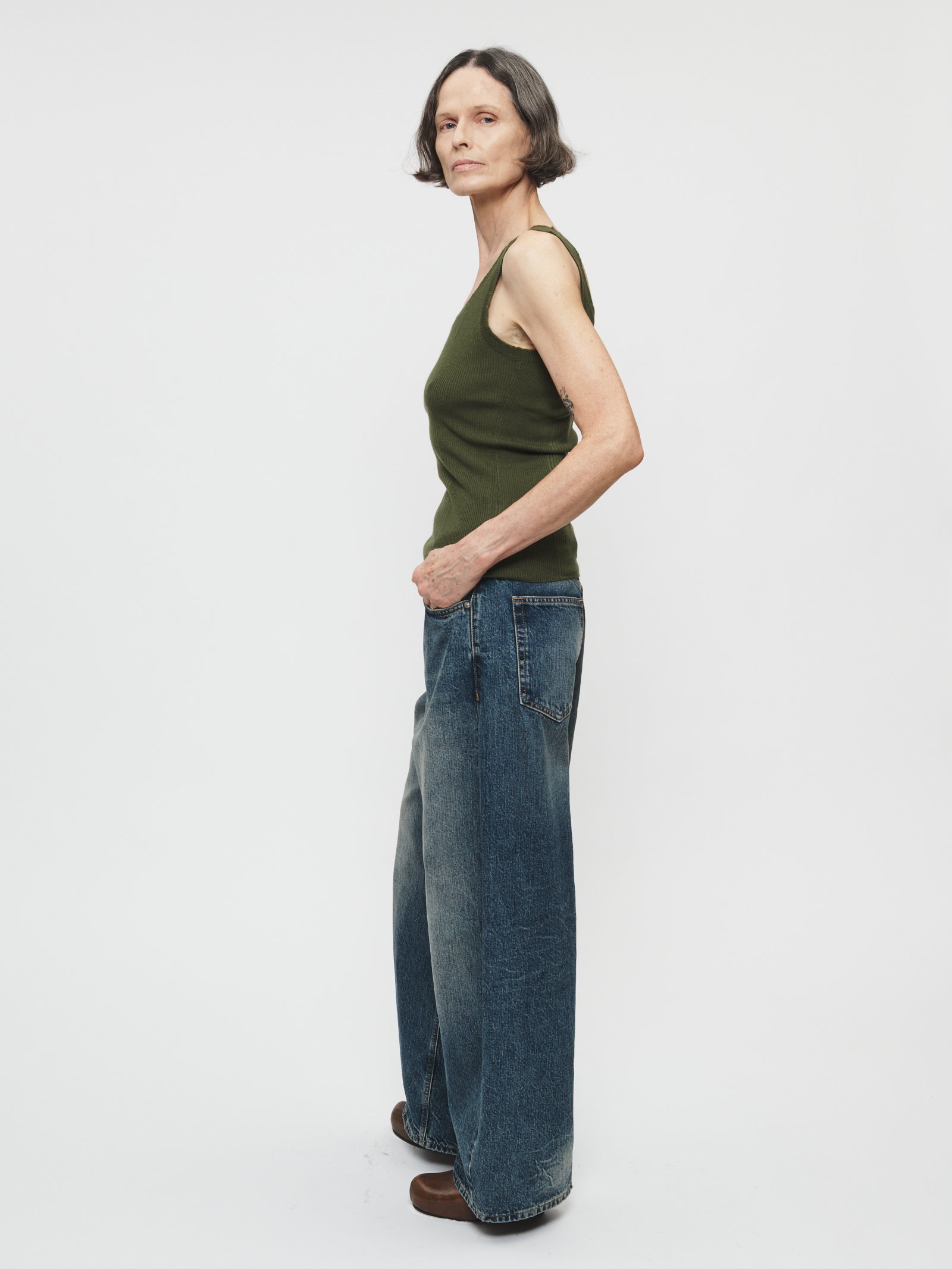 Sylke is 5'9" and wearing a size Small, paired with the Roomy Jean in Rugged Mid Blue.