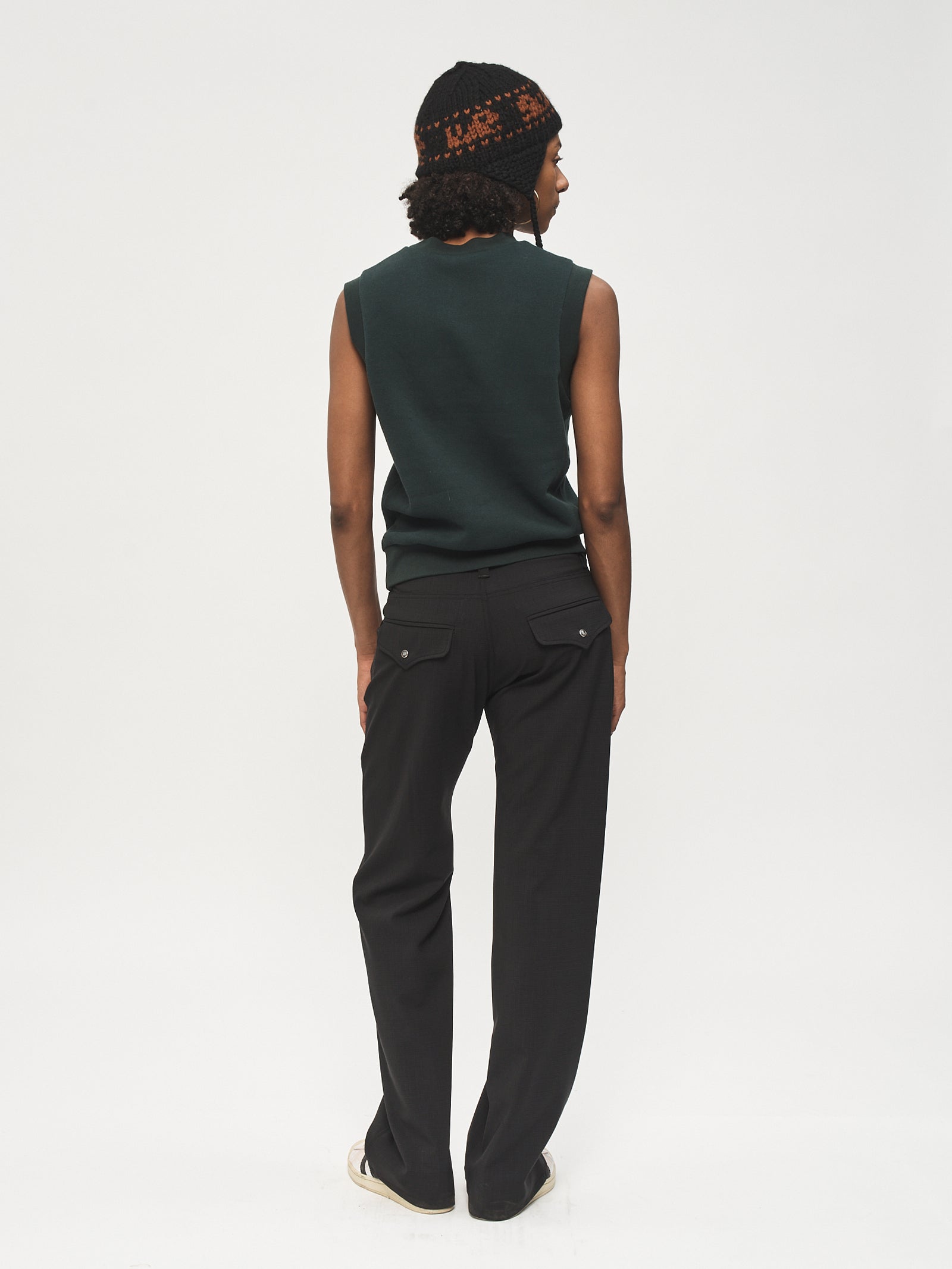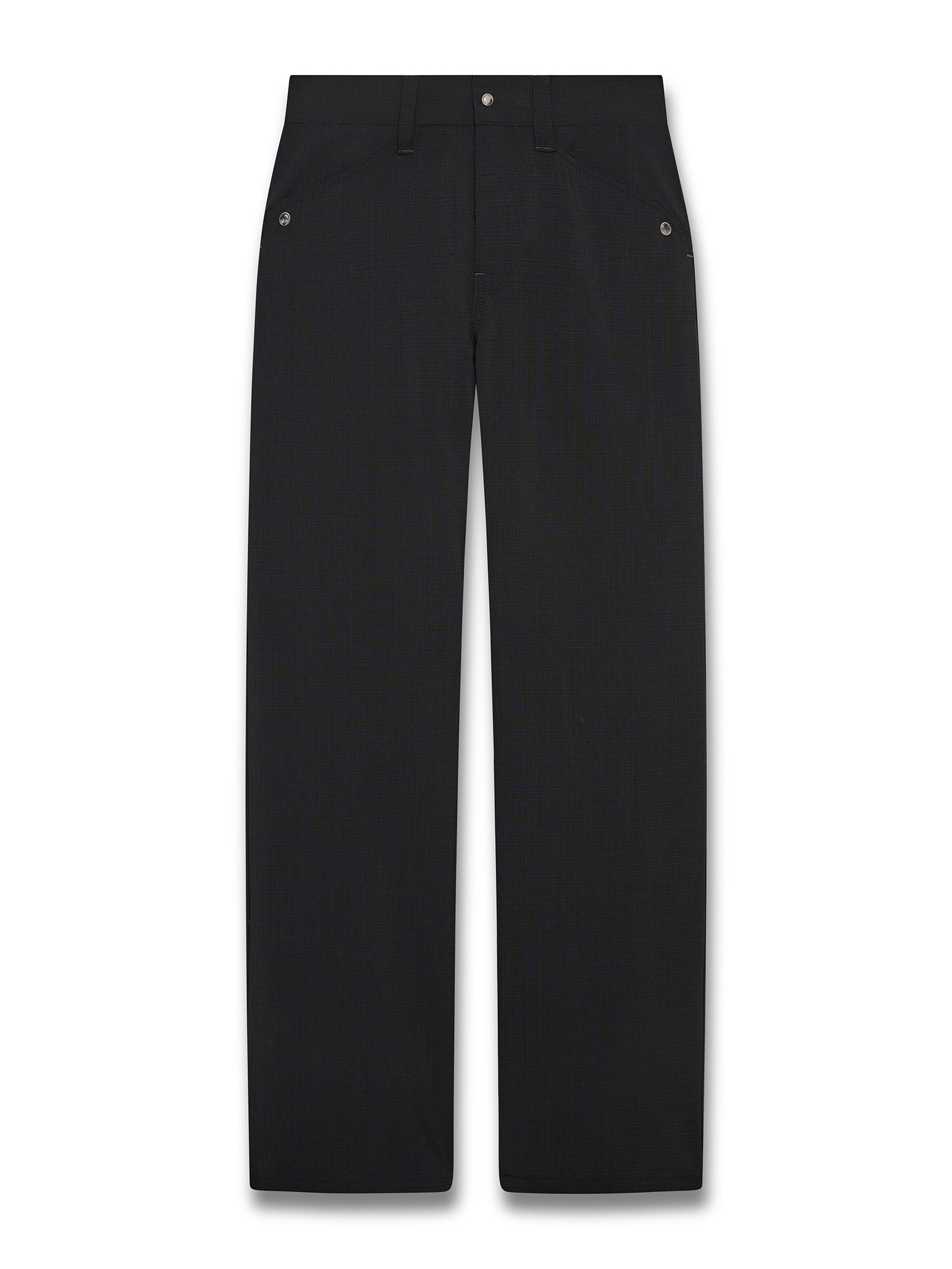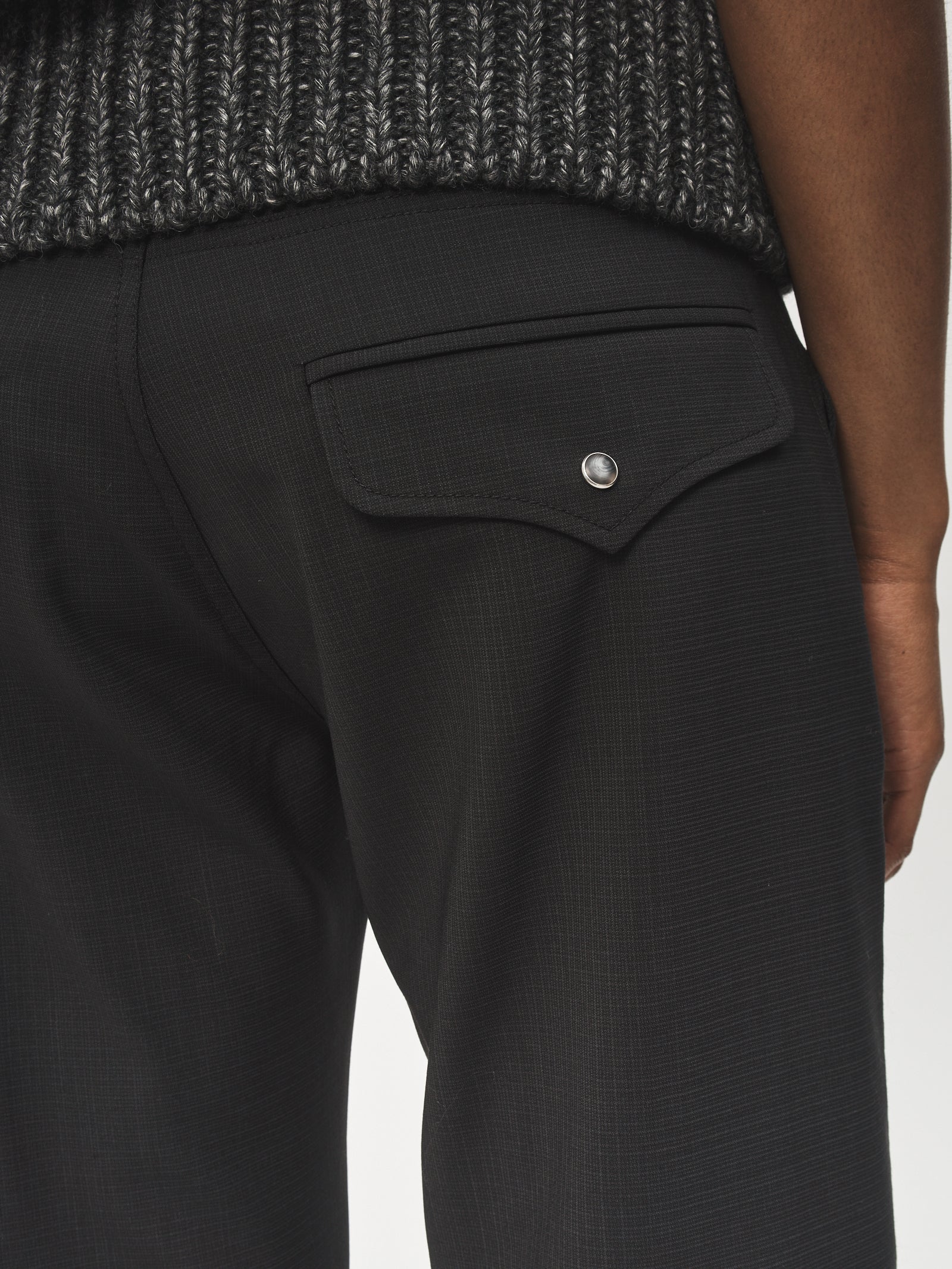 The Western Trouser is cut in an Italian Microcheck Tropical Wool. It has a low rise and straight leg with slight bootcut opening. Regular, wide waistband with zip-fly and snap closure details. Slash front pockets, and flap pockets with snap closure.