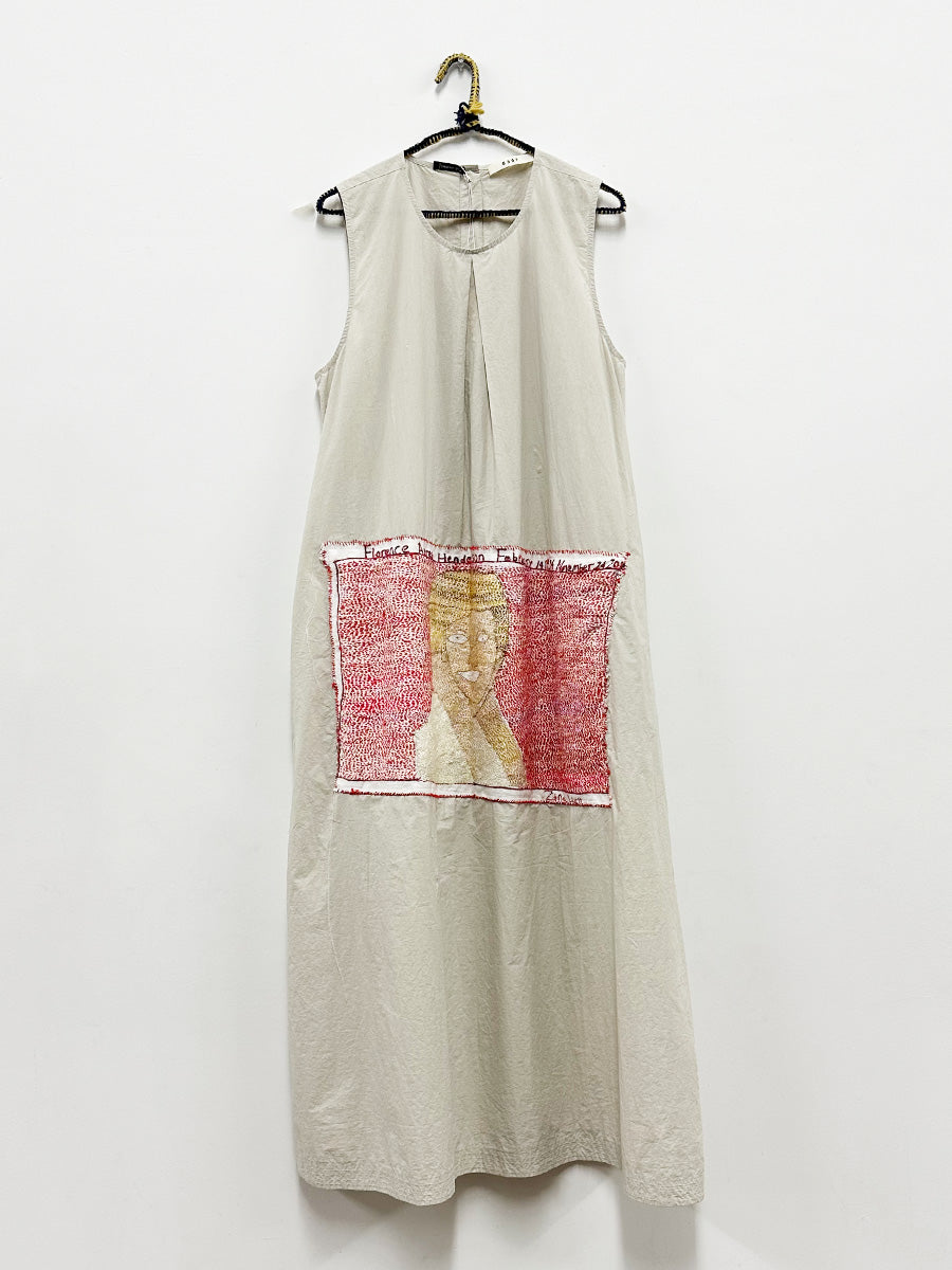 Sleeveless, full length dress with artwork by Creative Growth Artist Zina Hall. Front inverted pleat for volume. Back keyhole opening with snap closures. Center back slit. 100% Cotton.